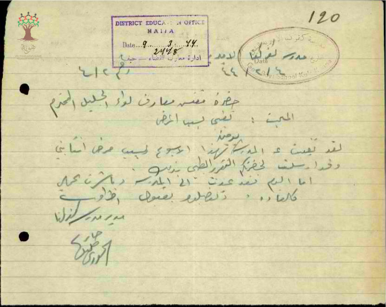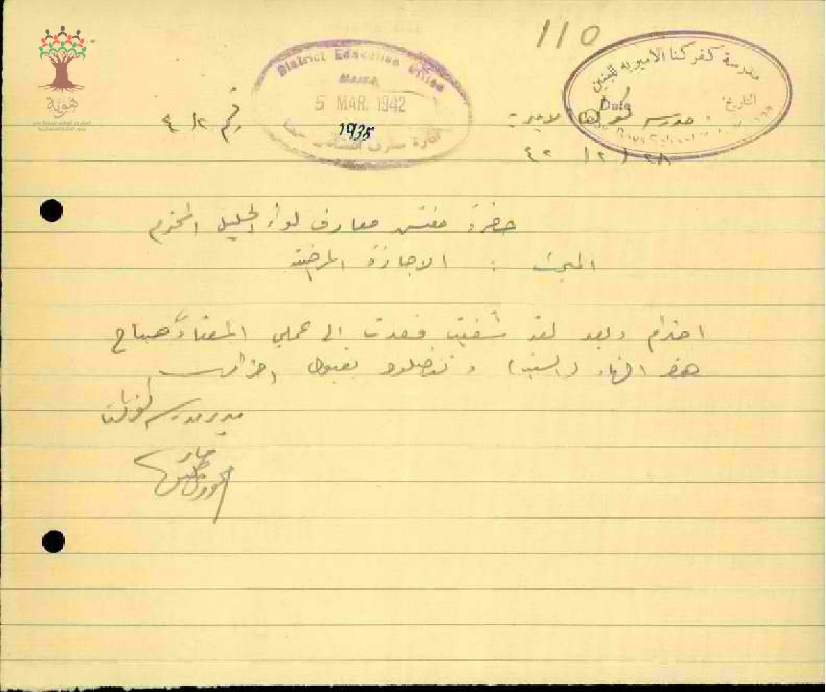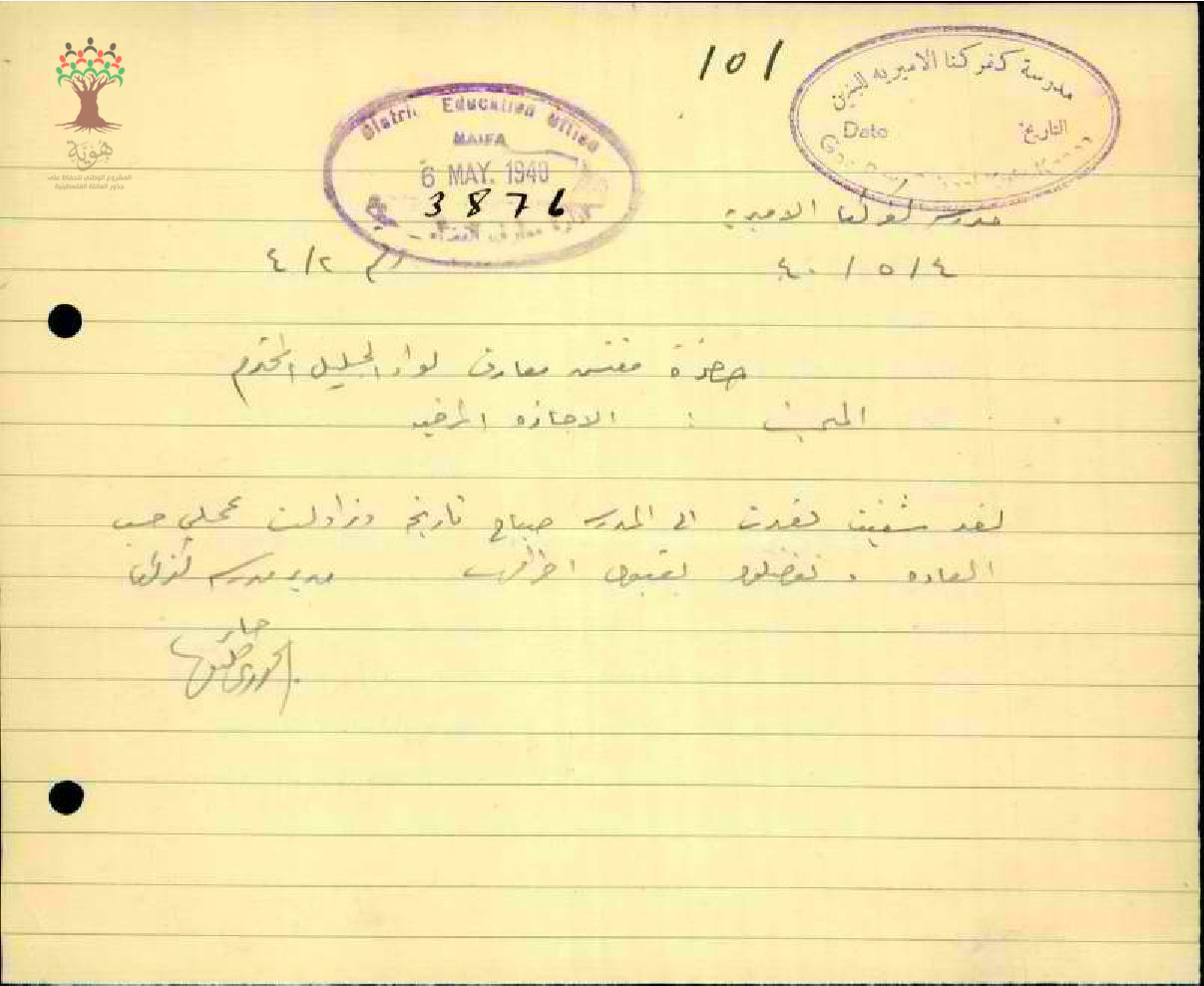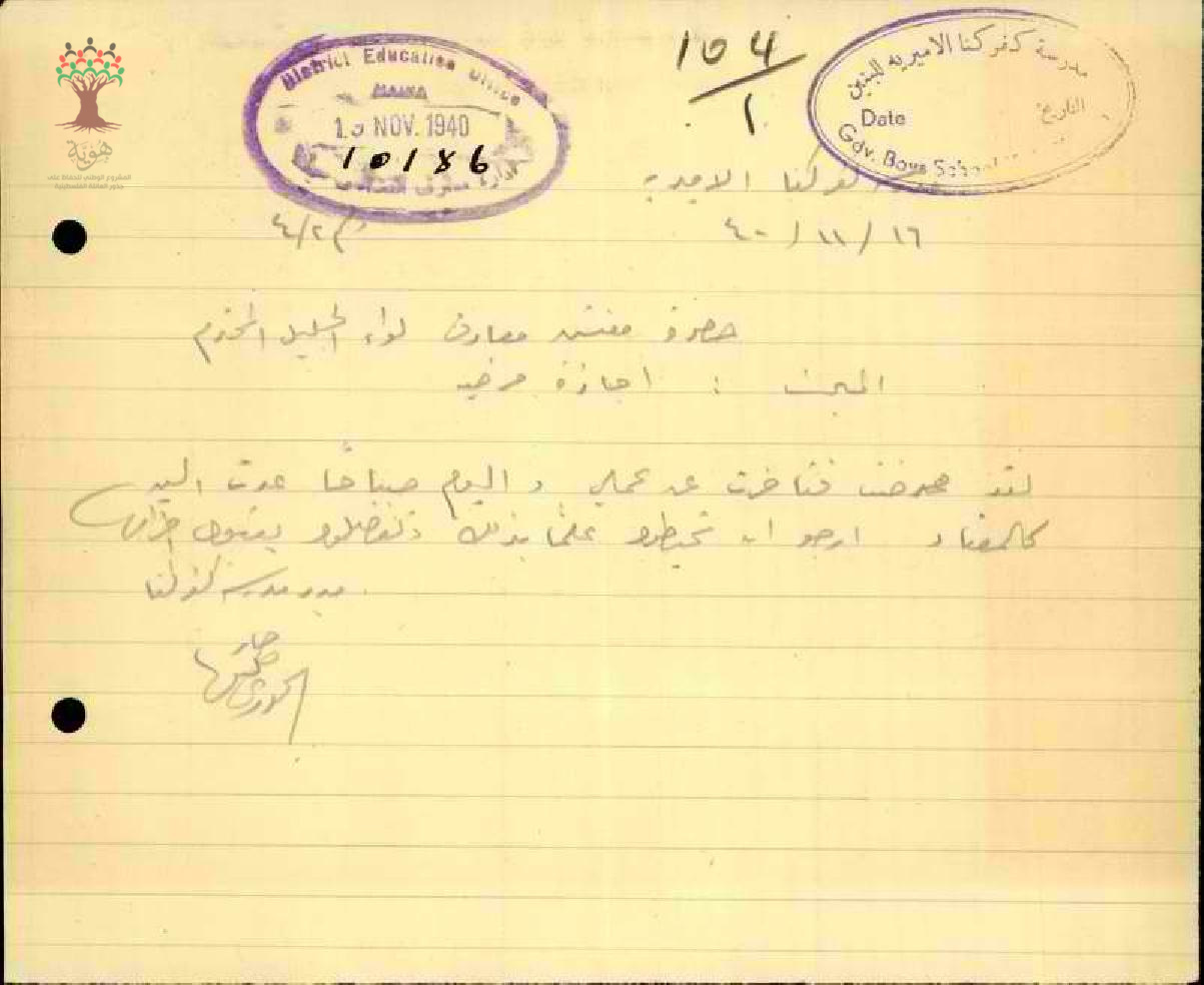 رسائل من المعلم جابر خوري إلى مفتش المعارف يعلمه بتاريخ عودته إلى العمل بعد انتهاء الاجازة المرضية