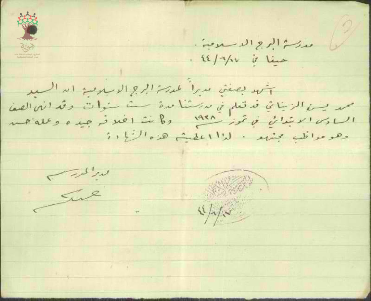 شهادة من مدير مدرسة البرج الإسلامية ل ياسين زيناتي بخصوص طلب الجنسية/حيفا