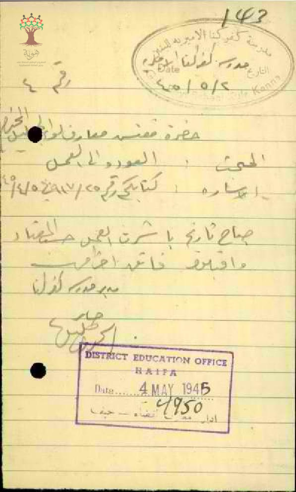 رسالة من المعلم جابر خوري إلى مفتش المعارف يعلمه بعودته إلى العمل في المدرسة