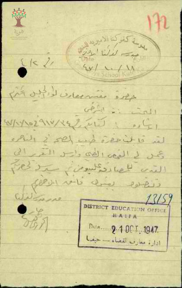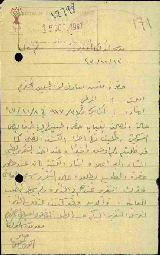 رسائل من مفتش المعارف إلى المعلم جابر خوري يبحث معه مرضه ومراجعة طبيب الصحة ليجري الفحص الطبي و رد المعلم جابر خوري عليه