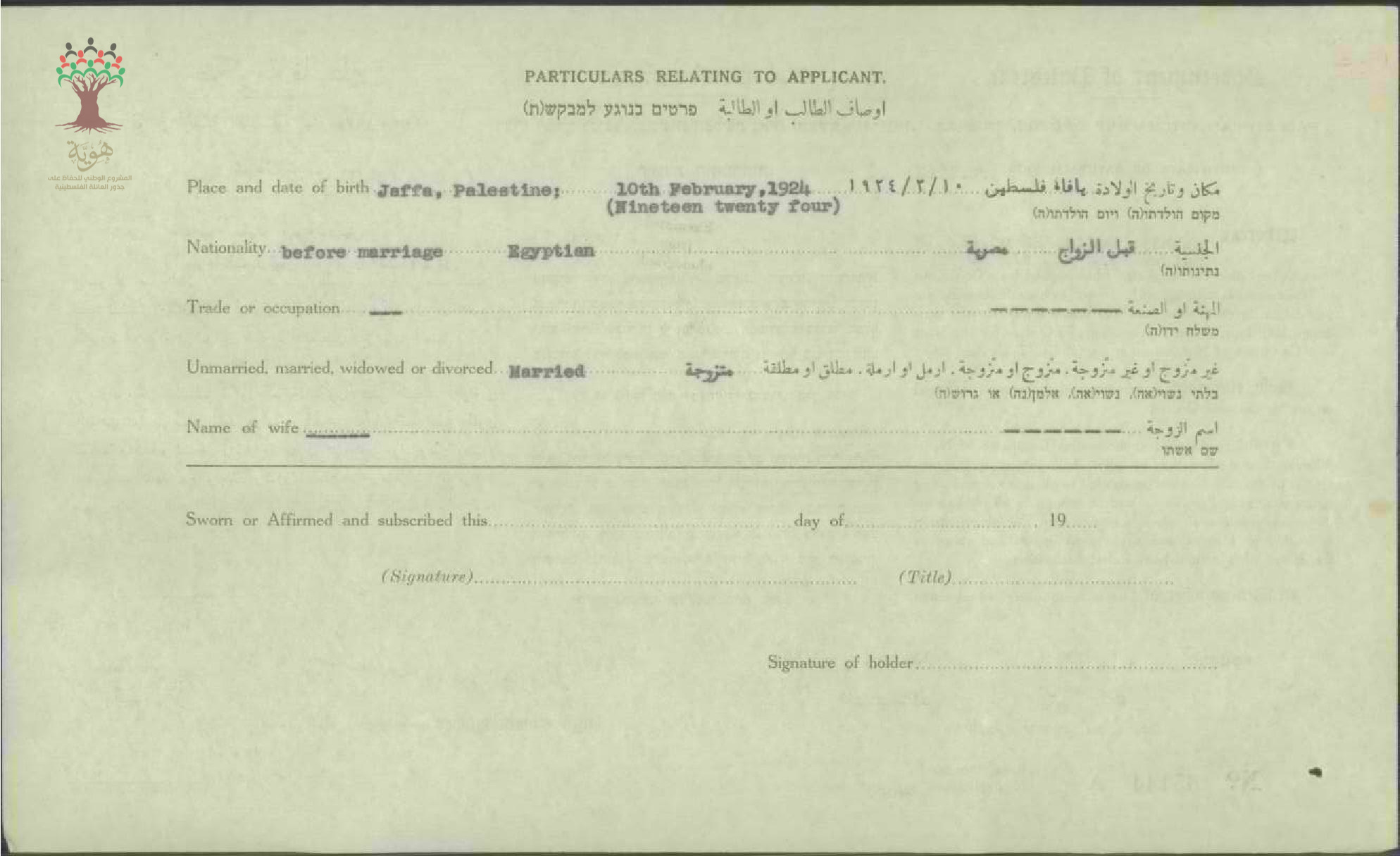شهادة الجنسية الفلسطينية ل صبحية عبد العال أبو الجبين