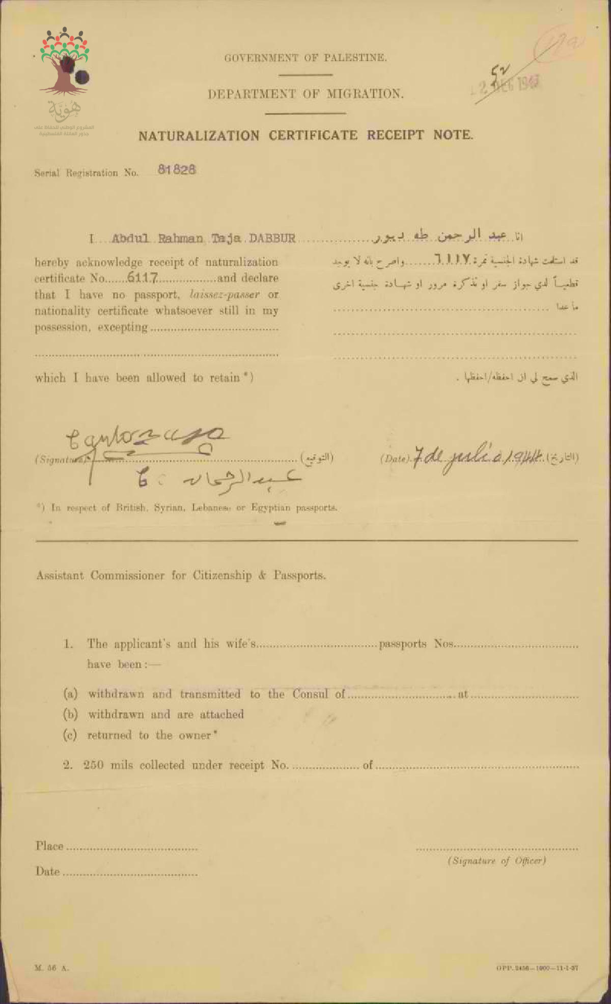 إيصال موقع من عبد الرحمن دبور باستلام شهادة الجنسية الفلسطينية