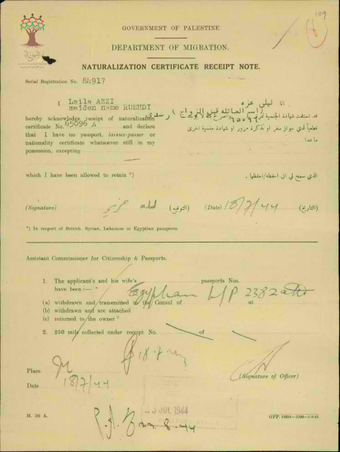 إيصال موقع من ليلى رشدي عزة باستلام شهادة الجنسية الفلسطينية