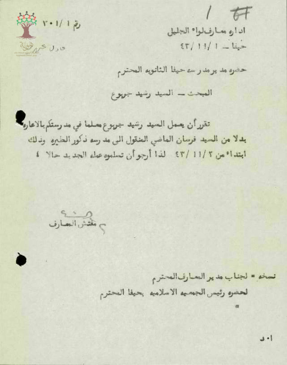 رسالة من مفتش المعارف إلى مدير مدرسة حيفا يخبره بقرار تعيين المعلم رشيد جربوع معلماً في مدرسة حيفا بدل المعلم فرسان الماضي