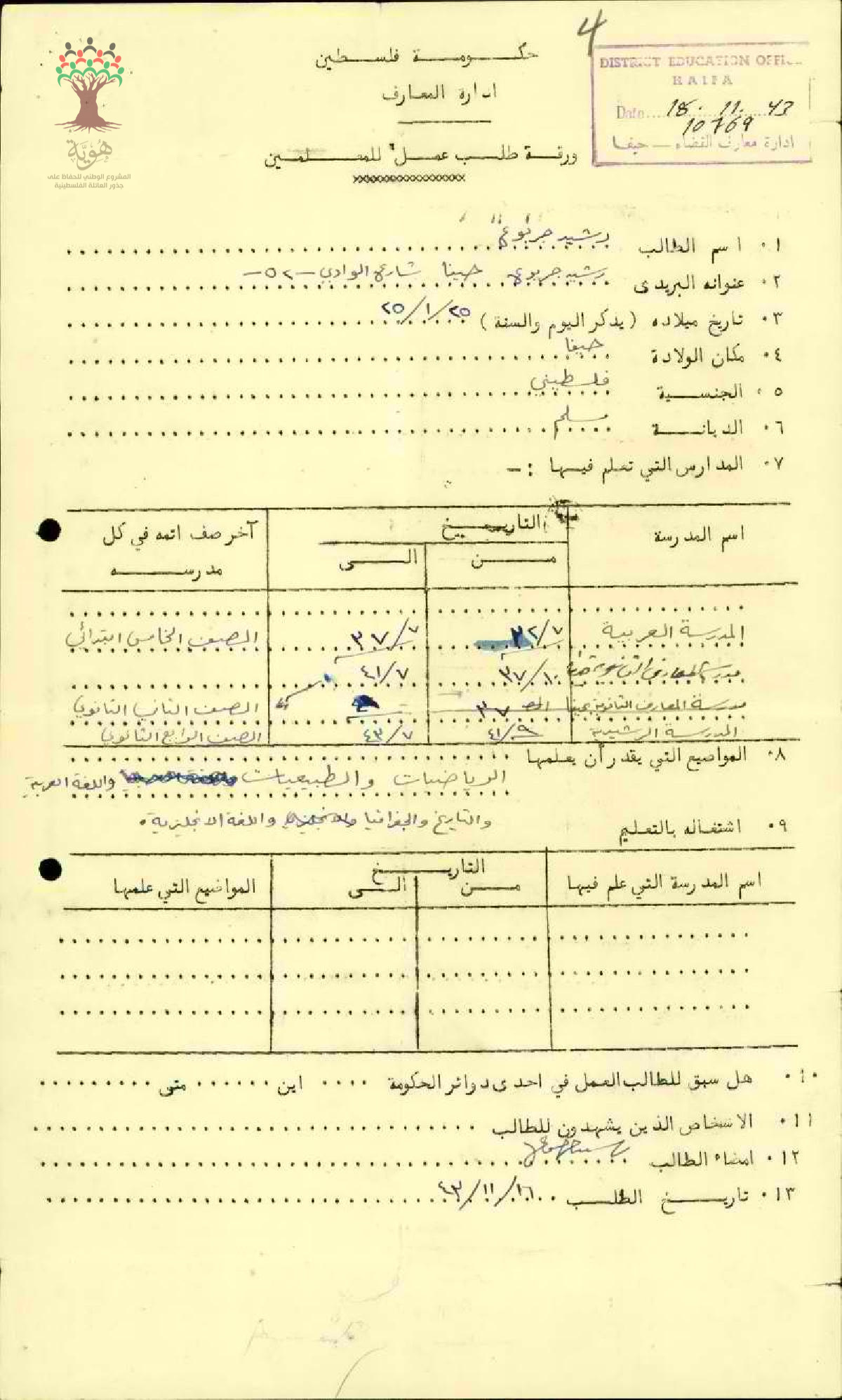 ورقة طلب عمل للمعلم رشيد جربوع /حيفا
