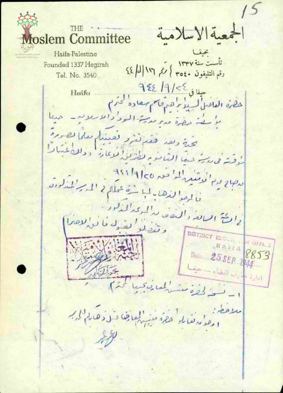 رسالة من الجمعية الاسلامية - حيفا إلى المعلم ابراهيم قاسم سعادة تعلمه بقرار تعيينه معلماً مؤقتاً في مدرسة حيفا