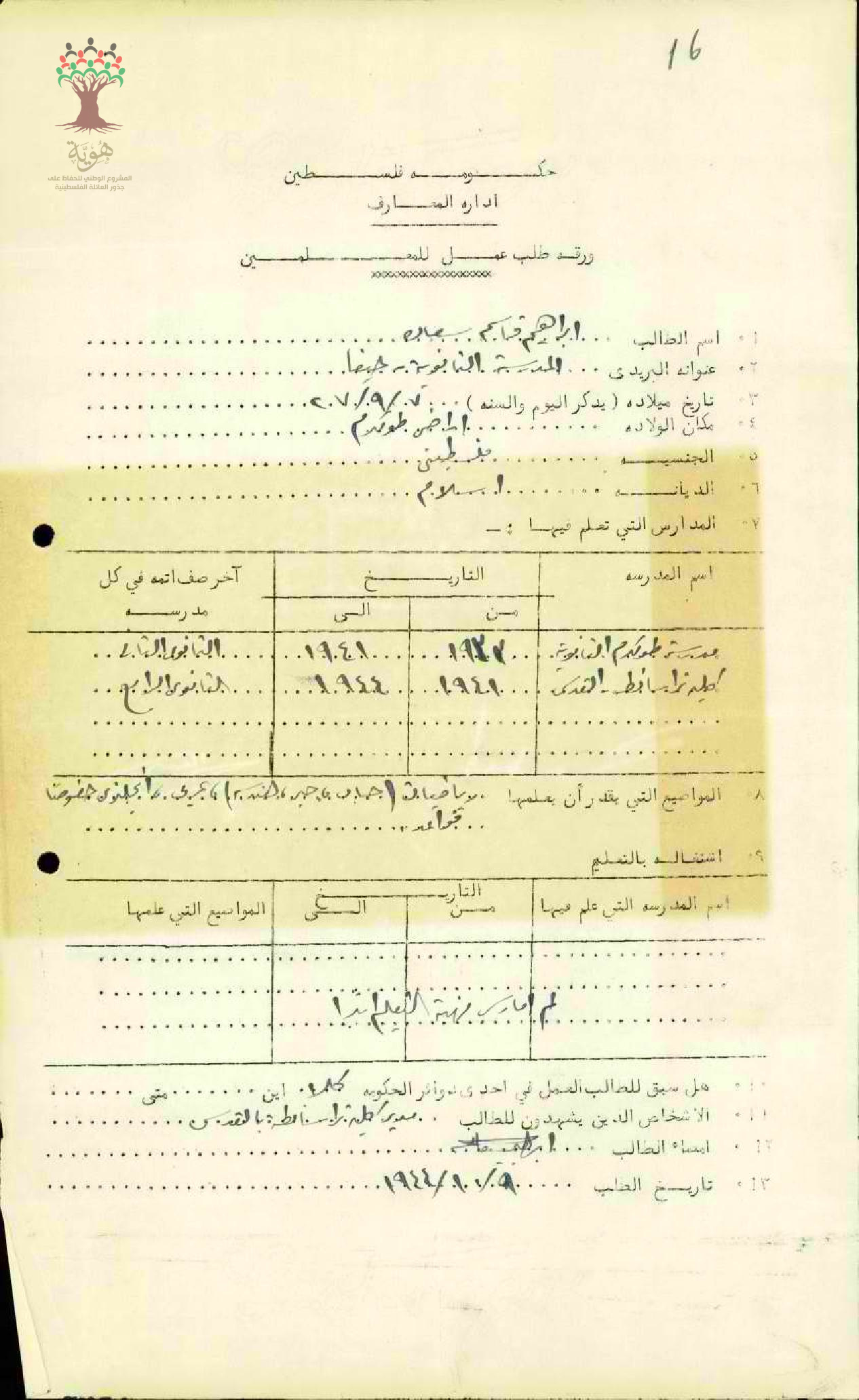 ورقة طلب عمل للمعلم ابراهيم سعادة/طولكرم