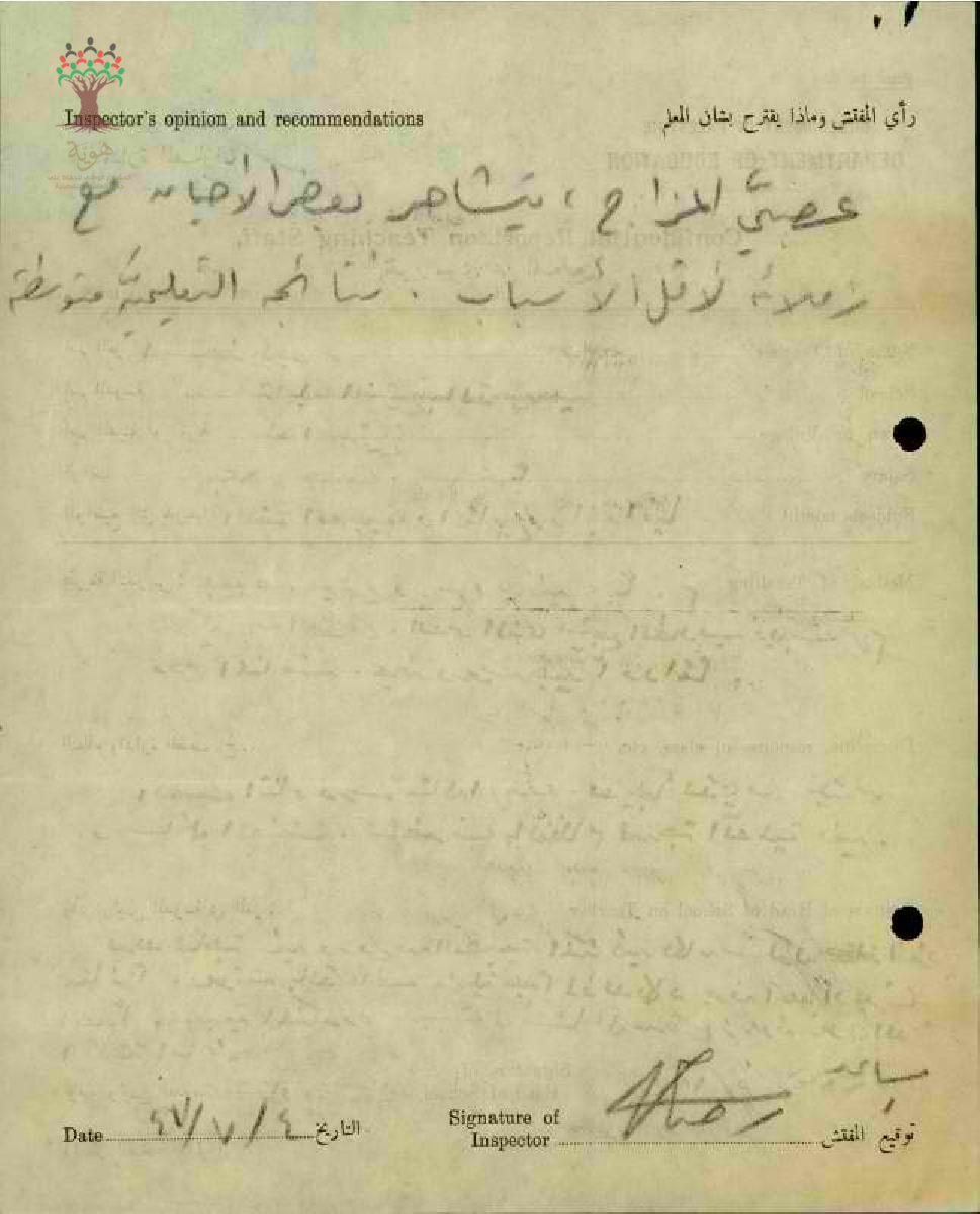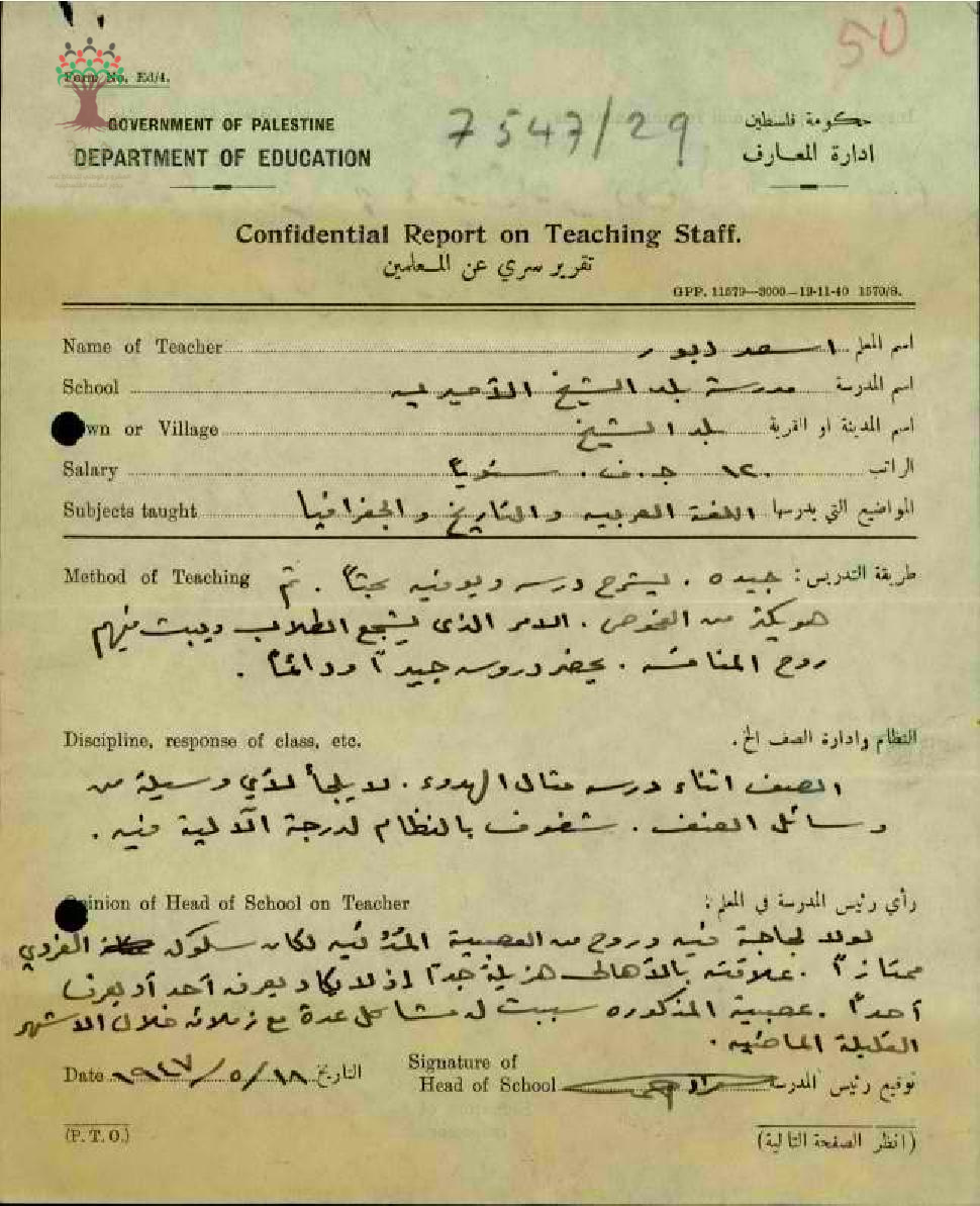 تقرير تفصيلي عن أداء المعلم أسعد دبور في مدرسة بلد الشيخ الأميرية سنة 1947