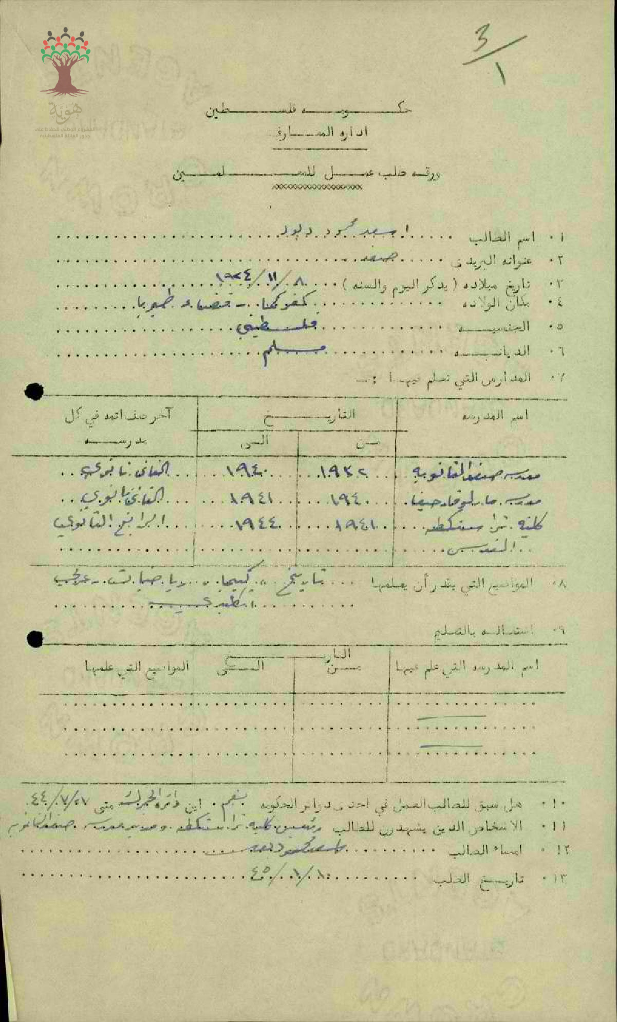 ورقة طلب عمل للمعلم أسعد دبور/صفد