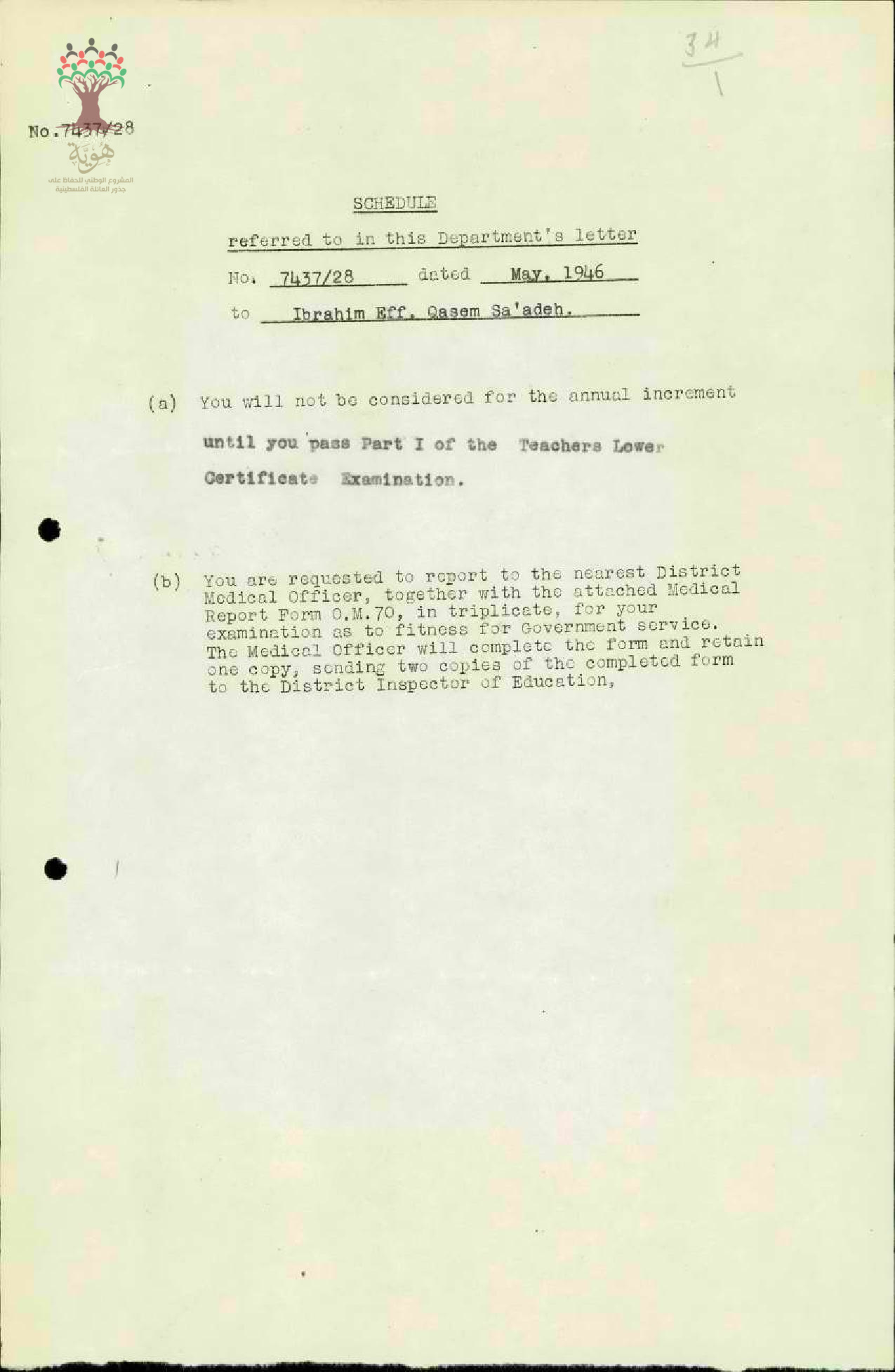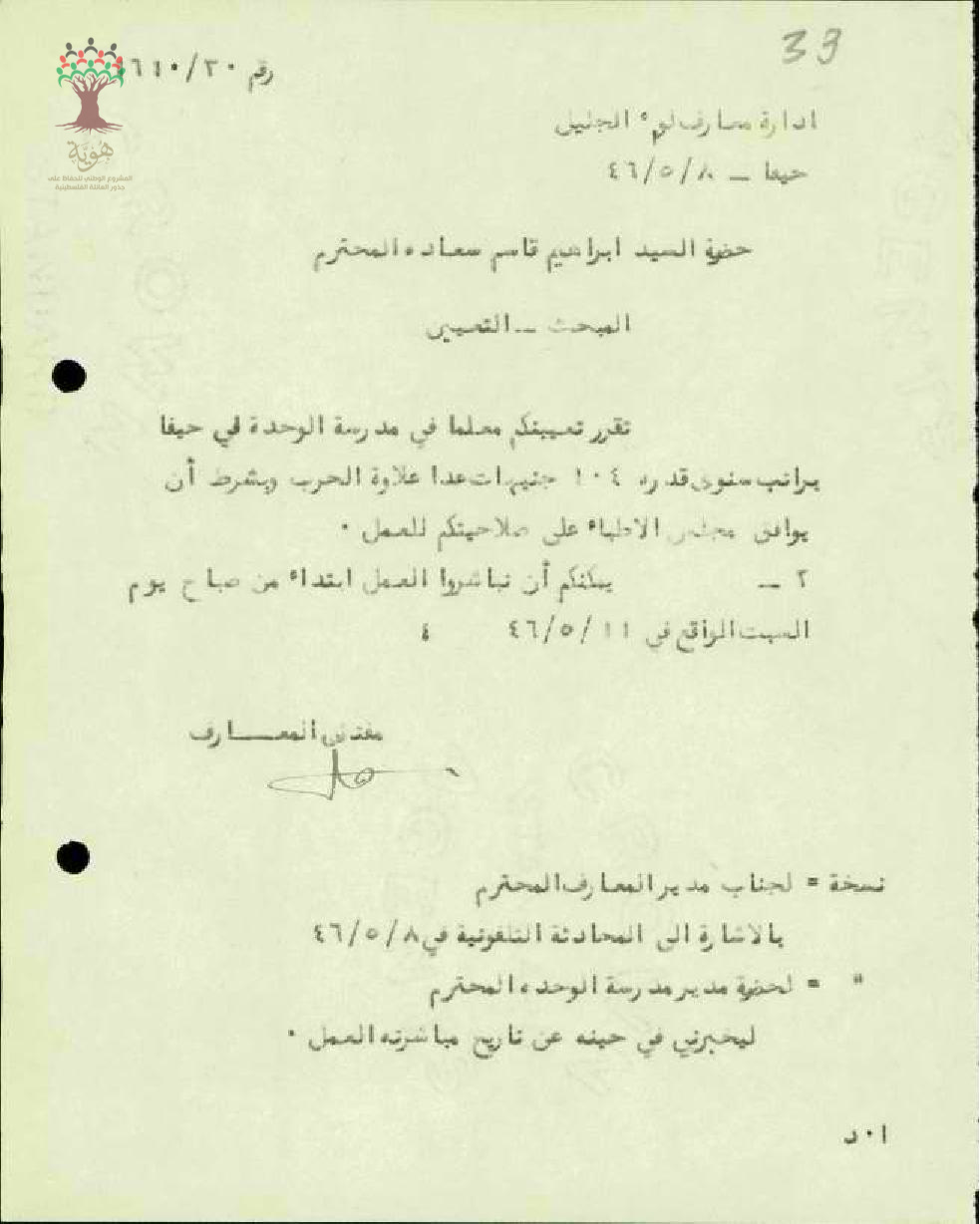 رسالة من مفتش المعارف إلى المعلم ابراهيم سعادة يبحث معه قرار تعيينه في مدرسة الوحدة