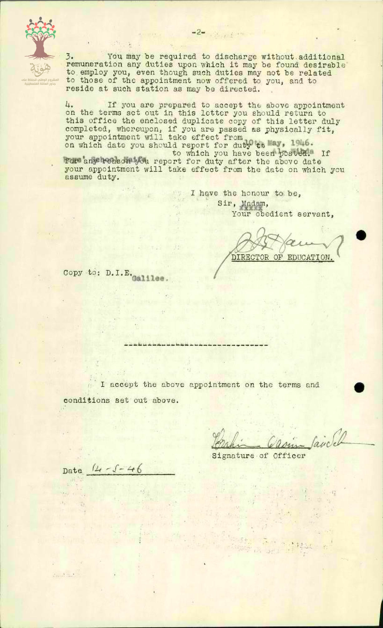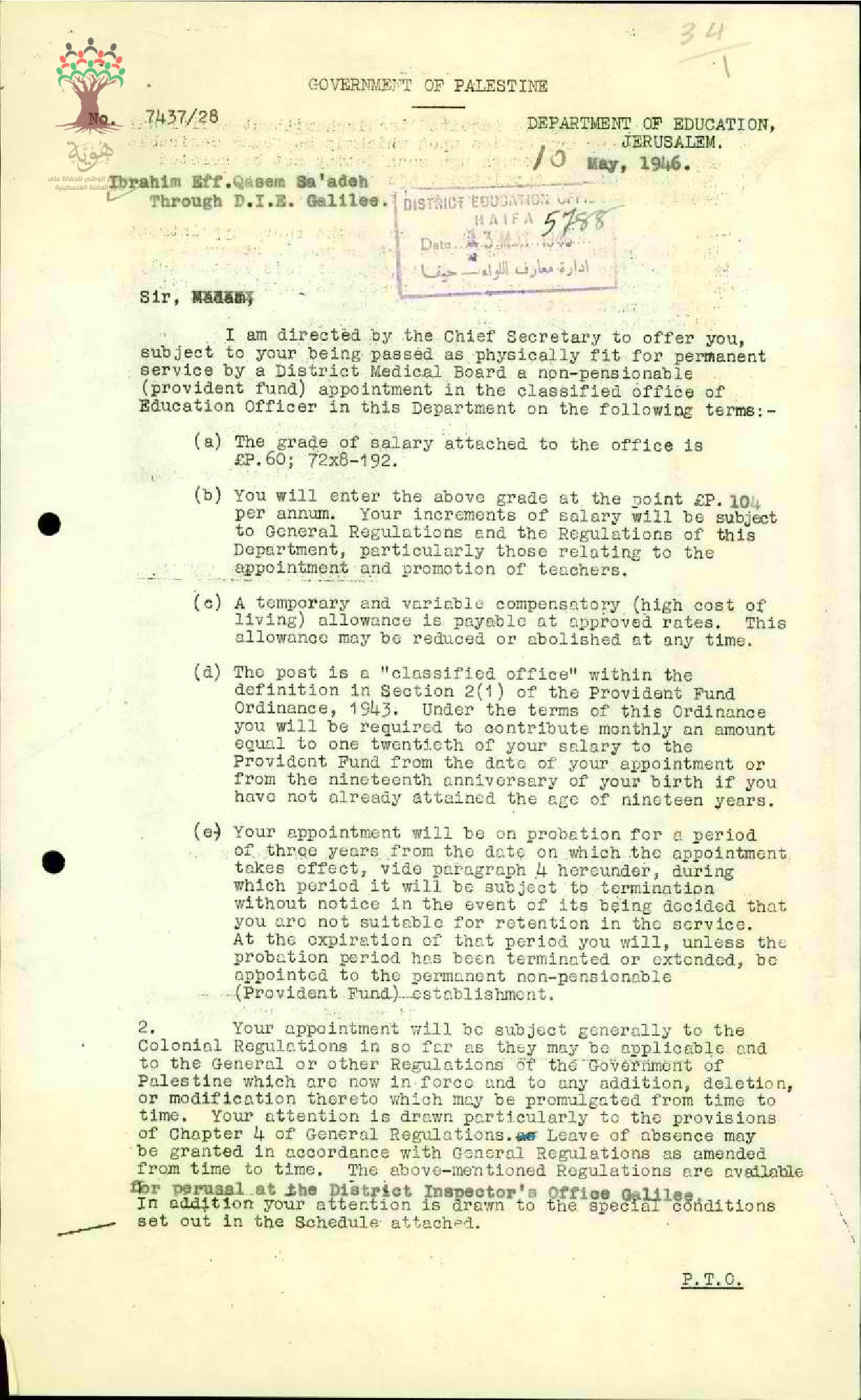 رسالة من مدير المعارف إلى المعلم ابراهيم سعادة يبحث معه قرار تعينه في إدارة المعارف