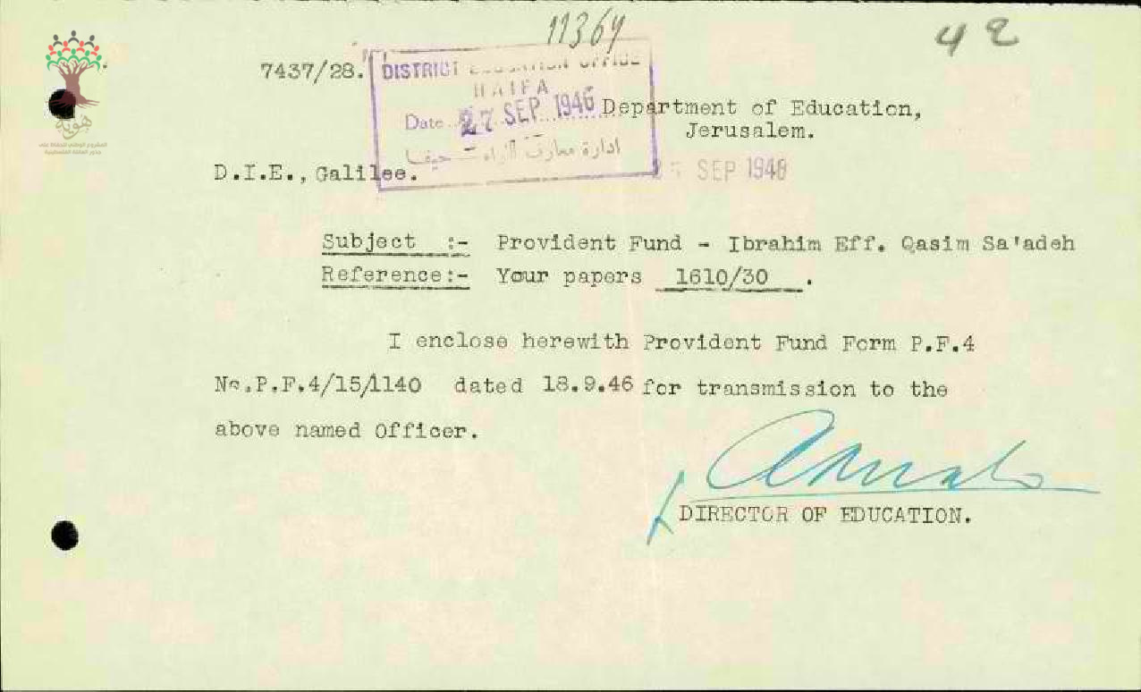 رسالة من مفتش المعارف إلى المعلم ابراهيم سعادة يعلمه باشتراكه بصندوق الاحتياط