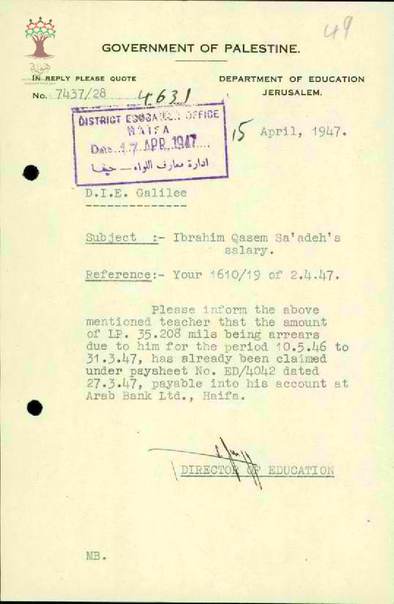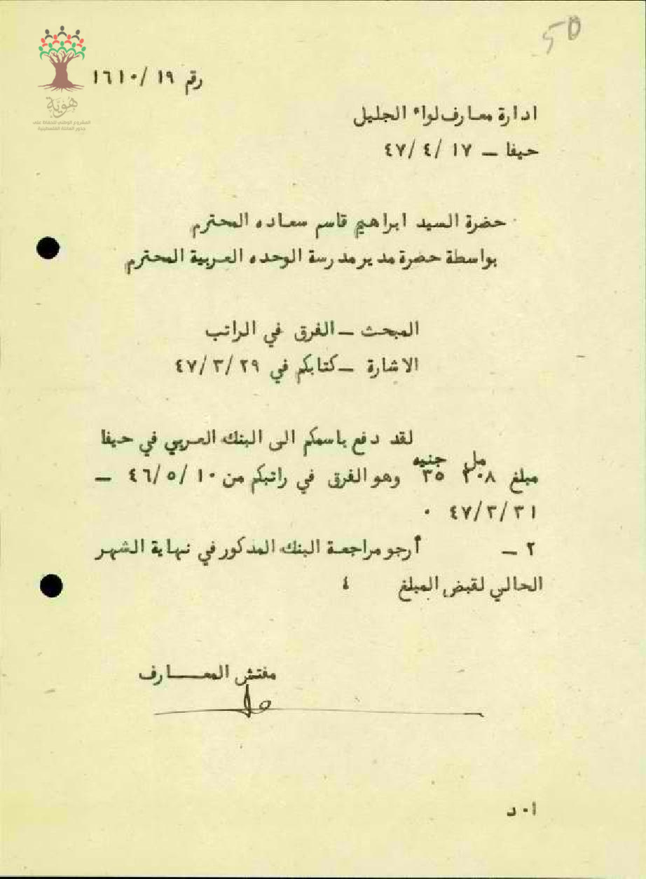 رسالة من مدير المعارف إلى مفتش المعارف يخبره بأنه تم دفع راتب المعلم ابراهيم سعادة إلى البنك العربي في حيفا