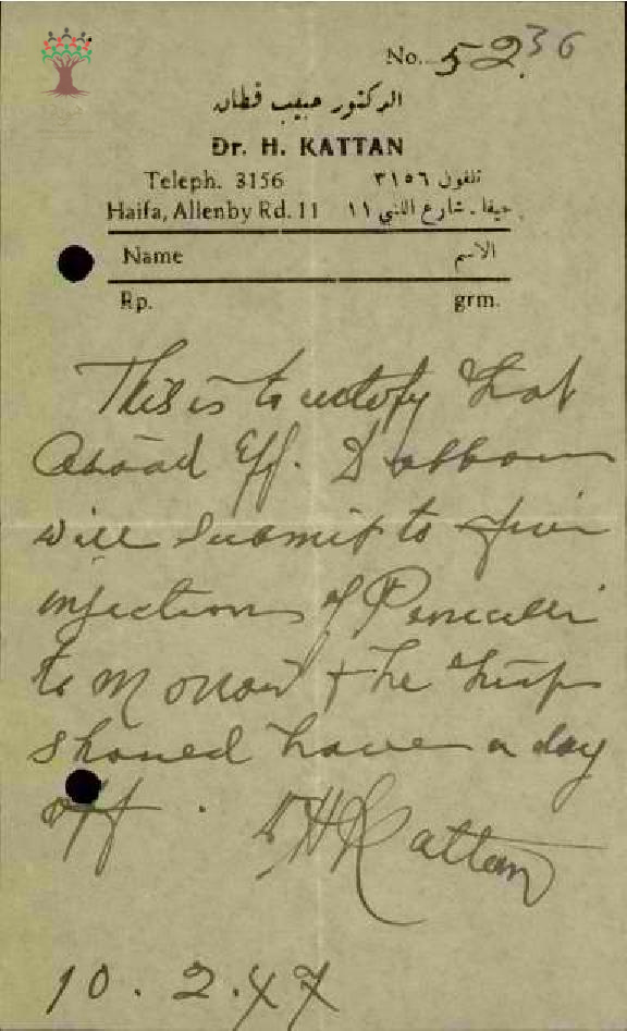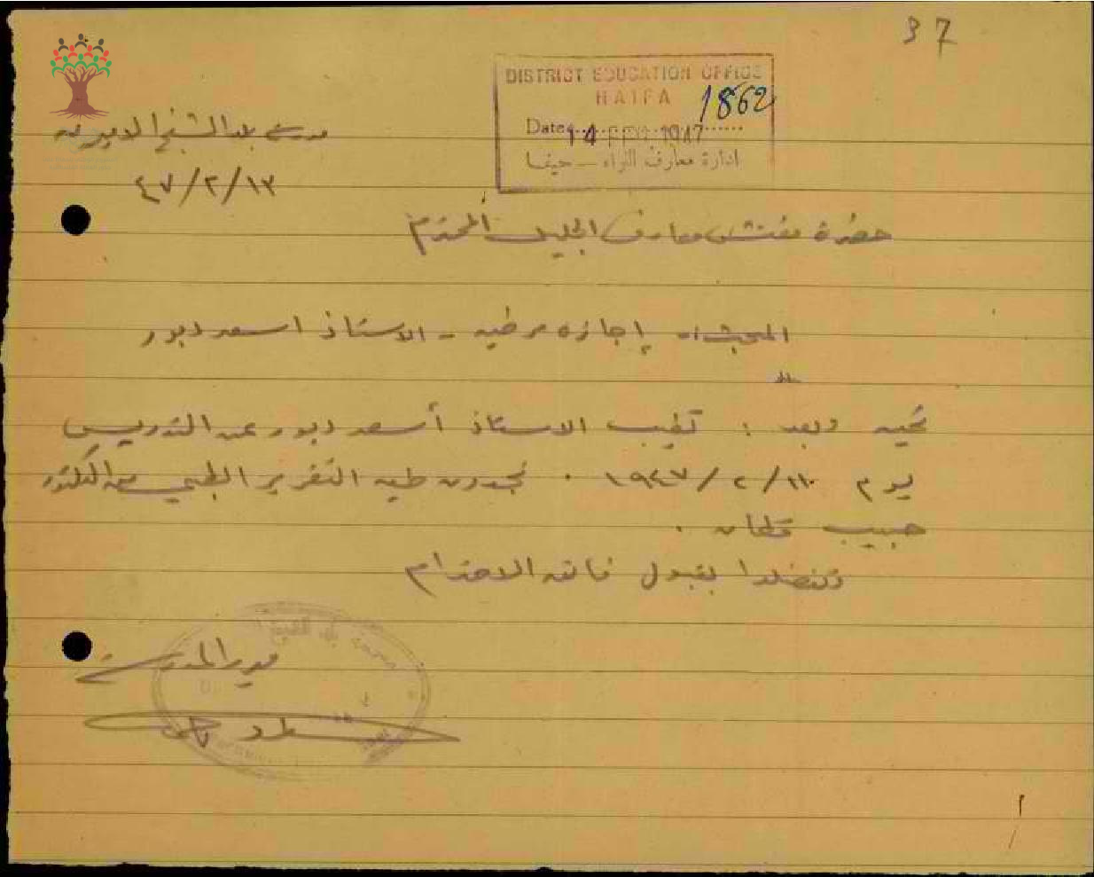 رسالة من مدير مدرسة بلد الشيخ الأميرية الى مفتش المعارف بخصوص طلب اجازة مرضية للمعلم أسعد دبور مرفق بتقرير طبي
