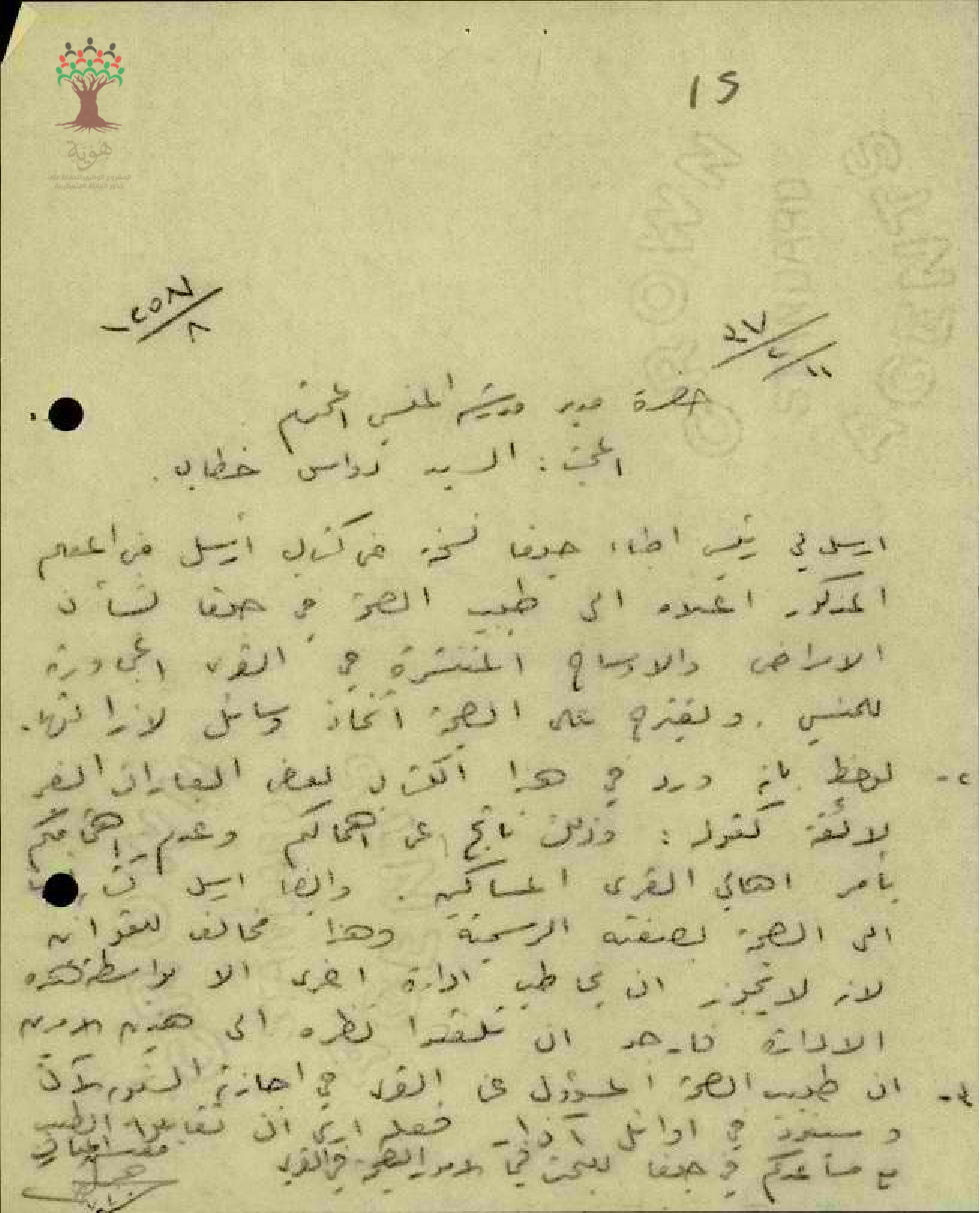 رسالة من مفتش المعارف إلى مدير مدرسة المنسي يبحث معه أمر رسالة المعلم دواس خطاب حول انتشار الاوبئة والأوساخ في القرى المجاورة للمنسي