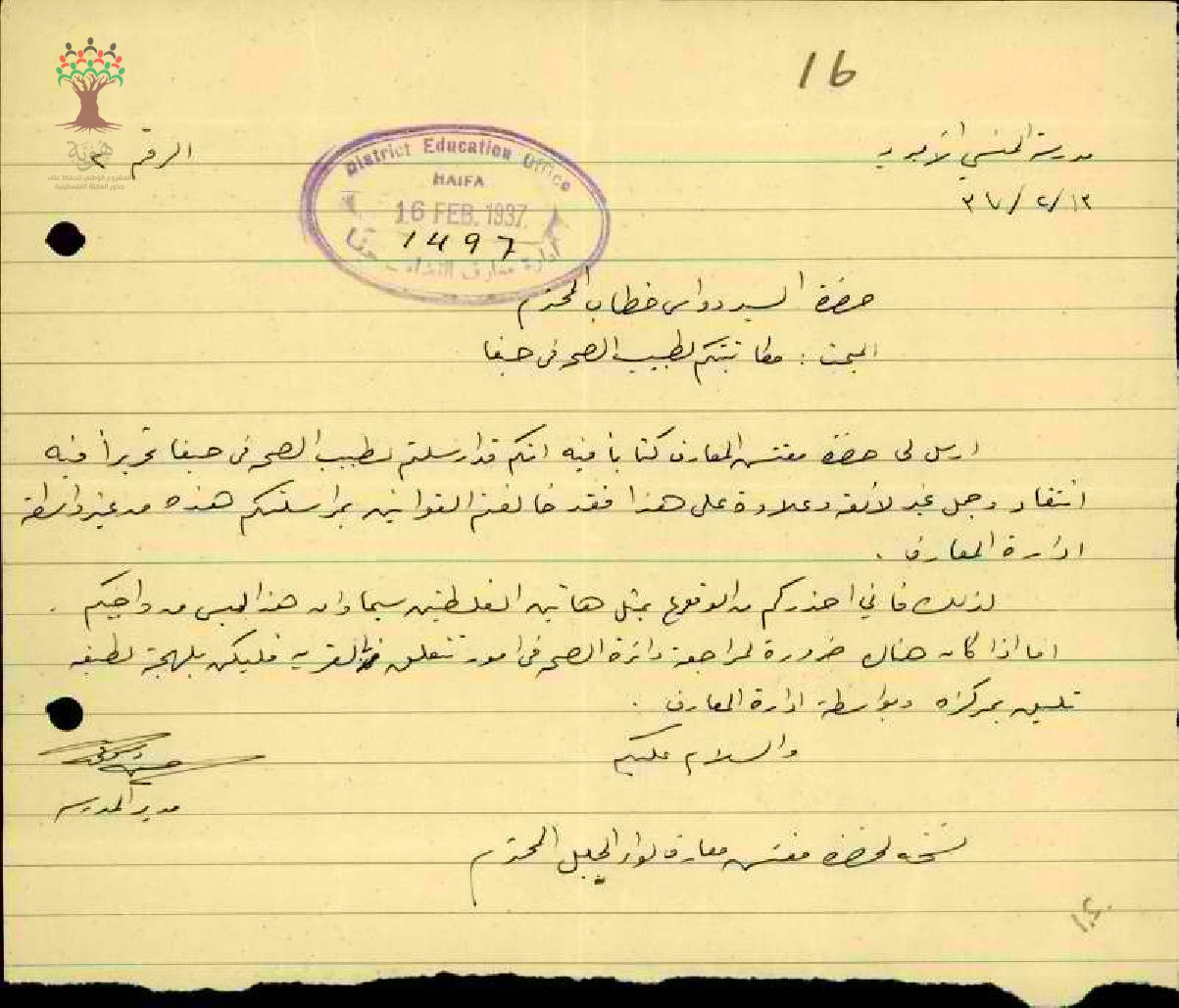 رسالة من مدير مدرسة المنسي إلى المعلم دواس خطاب حول رسالته لطبيب الصحة- حيفا والعبارات المستخدمة فيها
