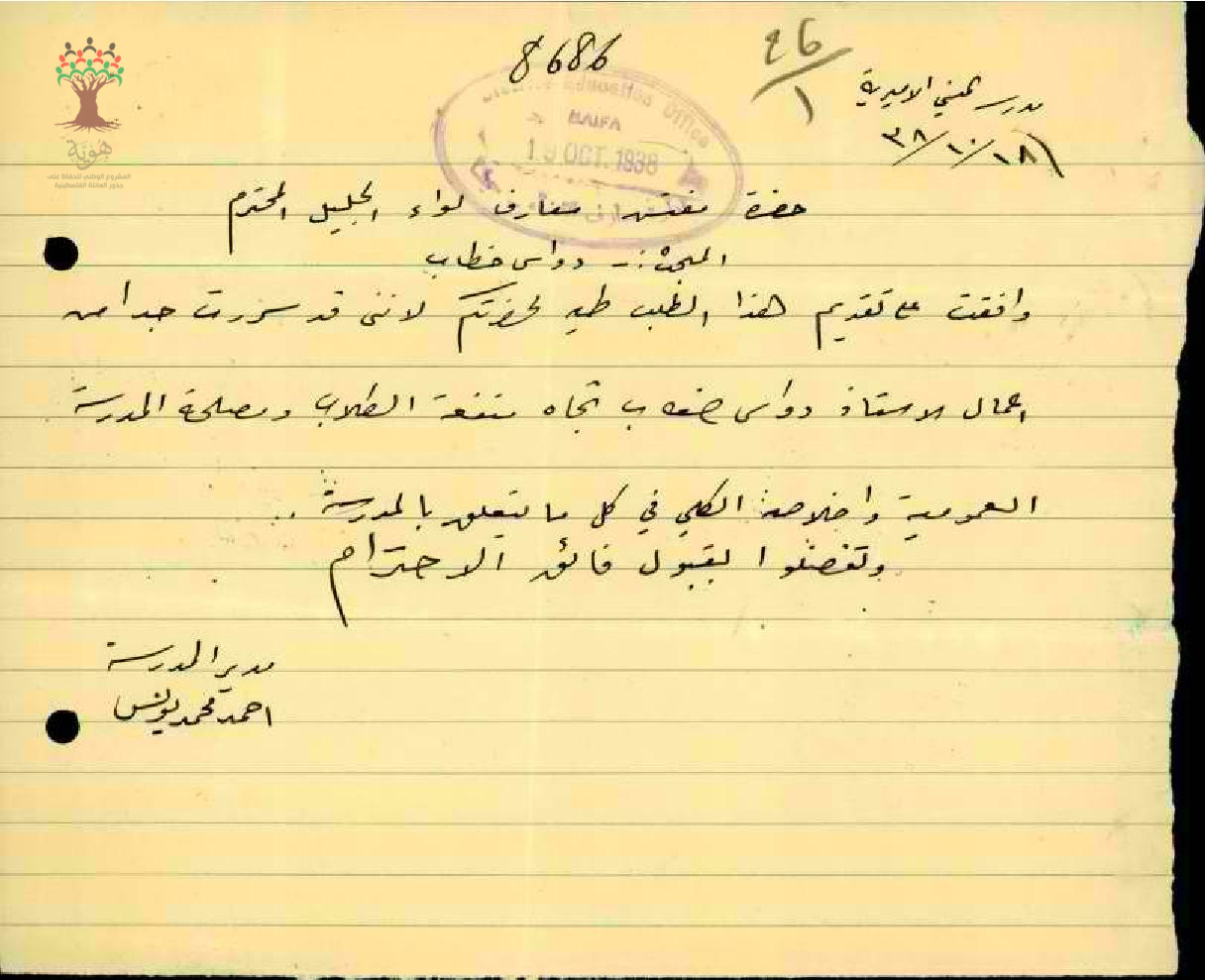رسالة من مدير مدرسة المنسي إلى مفتش المعارف يبحث معه أمر المعلم دواس خطاب ومدى سروره من أعماله اتجاه الطلاب واخلاصه