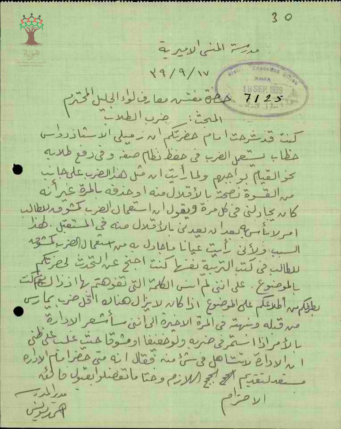 رسالة من مدير مدرسة المنسي إلى مفتش المعارف يبحث معه ضرب المعلم دواس خطاب للطلاب