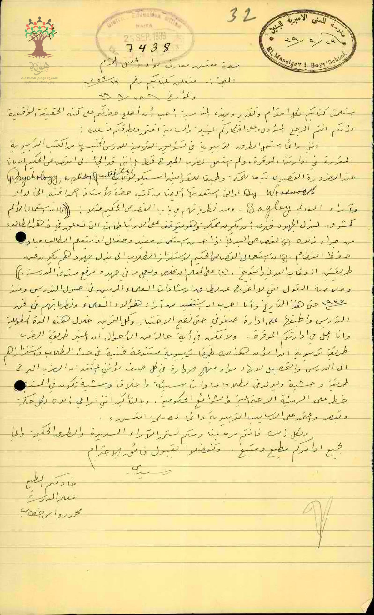 رسالة من المعلم دواس خطاب إلى مفتش المعارف يبرر فيها سبب استعمال الضرب ضد الطلاب