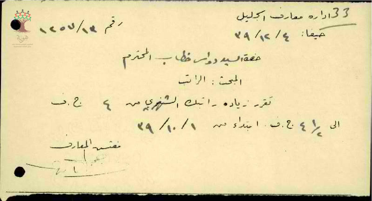 رسالة من مفتش المعارف إلى المعلم دواس خطاب يعلمه بقرار زيادة راتبه الشهري من 4ج.ف إلى 4.50 ج.ف