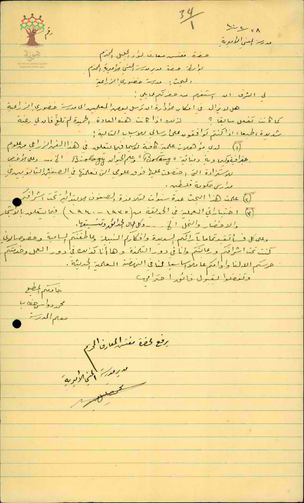 رسالة من المعلم دواس خطاي إلى مفتش المعارف يطلب نقله إلى مدرسة خضوري الزراعية
