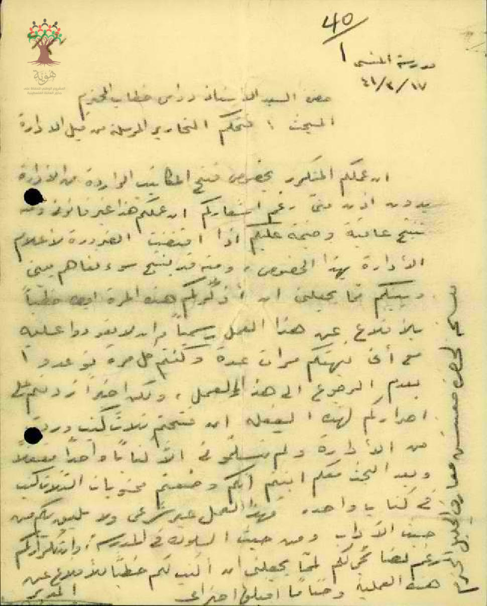 رسالة من مدير مدرسة المنسي إلى المعلم دواس خطاب يبحث معه فتحه التحارير المرسلة من قبل الإدارة