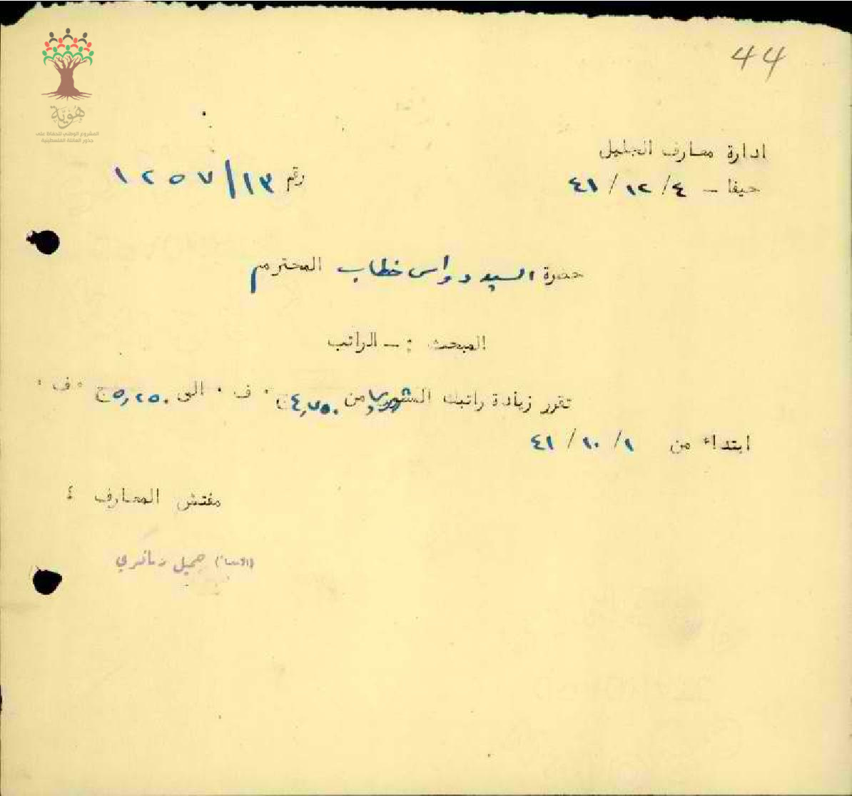 رسالة من مفتش المعارف إلى المعلم دواس خطاب يخبره بزيادة راتبه الشهري من 4.750 ج.ف إلى 5.250 ج. ف