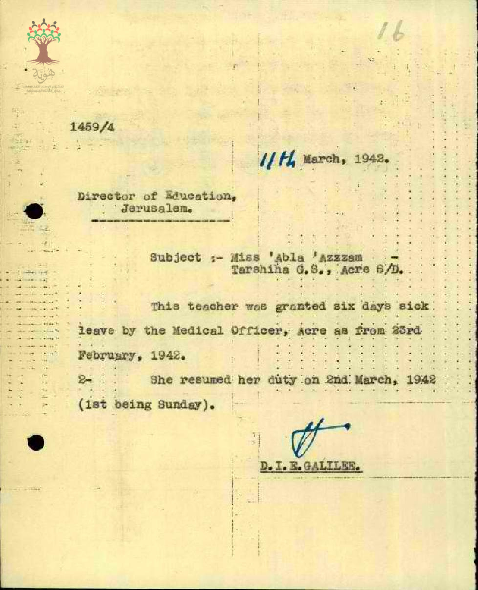 رسالة من مفتش المعارف الى مدير المعارف بخصوص اجازة مرضية للمعلمة عبلة عزام وعودتها الى العمل