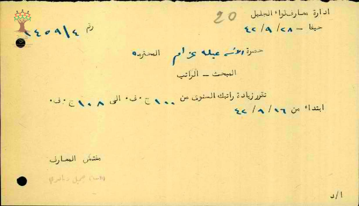 رسالة من مفتش المعارف الى المعلمة عبلة عزام بخصوص زيادة راتبها