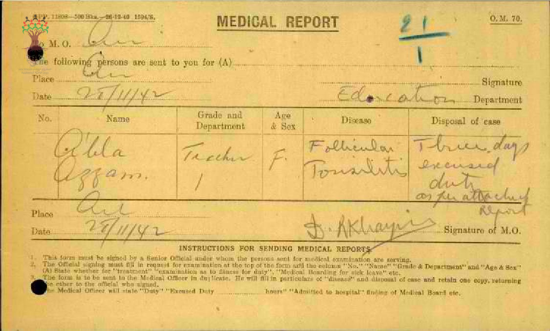 رسالة من مديرة مدرسة ترشيحا الى مفتش المعارف بخصوص غياب المعلمة عبلة عزام مرفقة بتقرير طبي