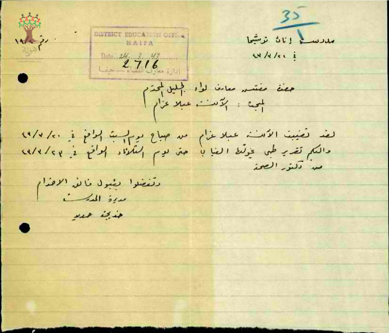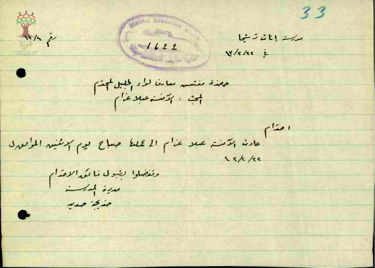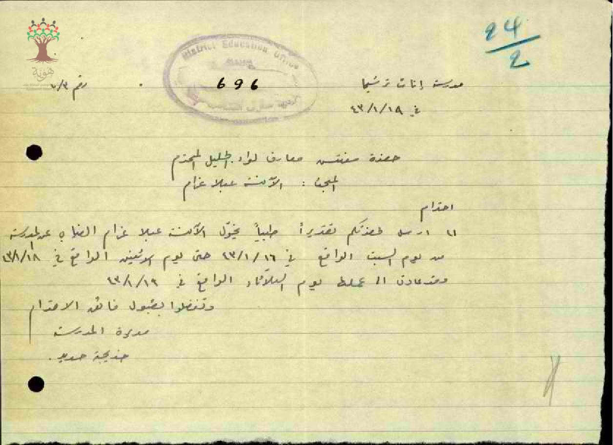 مجموعة رسائل من مديرة مدرسة ترشيحا للبنات الى مفتش المعارف بخصوص غياب وعودة المعلمة عبلة عزام