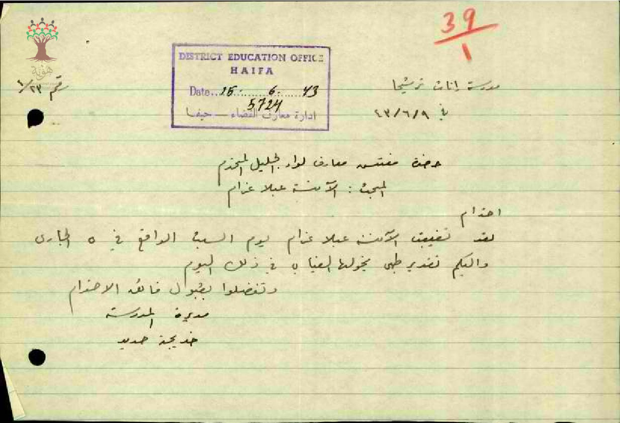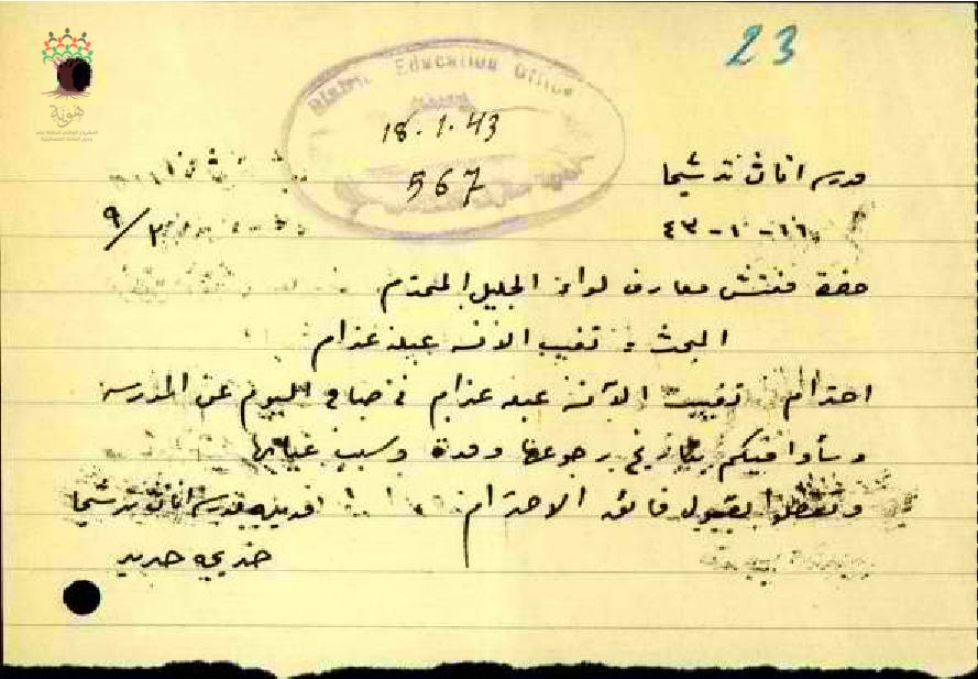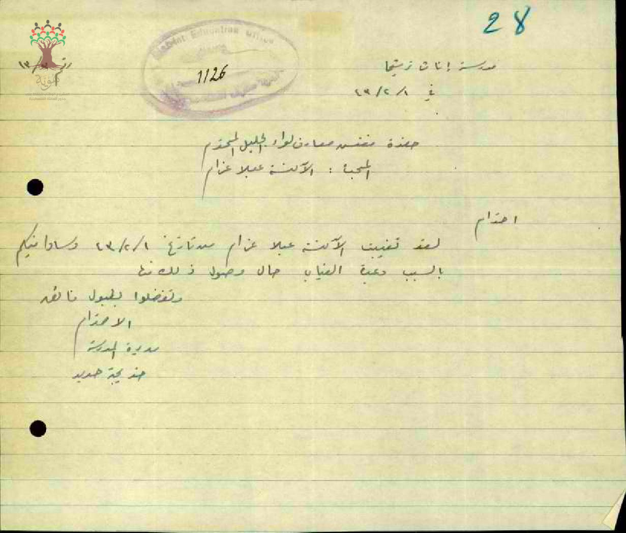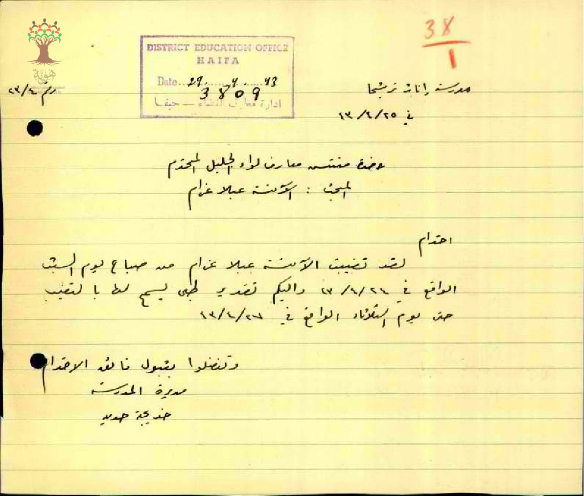 مجموعة رسائل من مديرة مدرسة ترشيحا للبنات الى مفتش المعارف بخصوص غياب وعودة المعلمة عبلة عزام