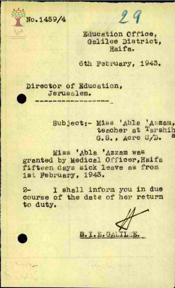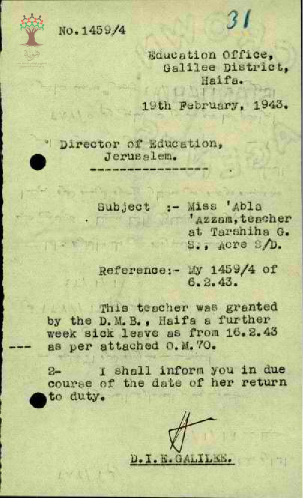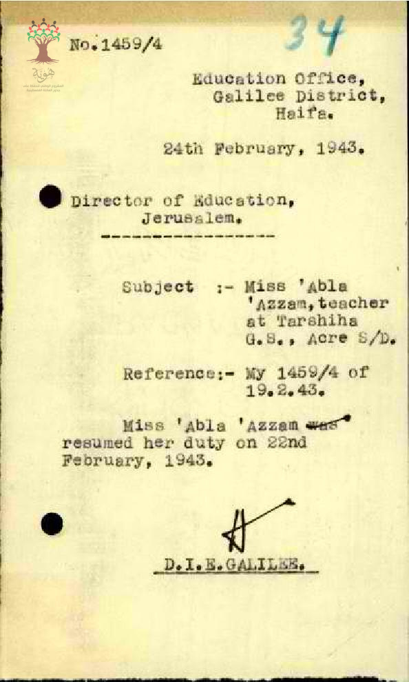 مجموعة رسائل من مفتش المعارف الى مدير المعارف بخصوص غياب وعودة المعلمة عبلة عزام