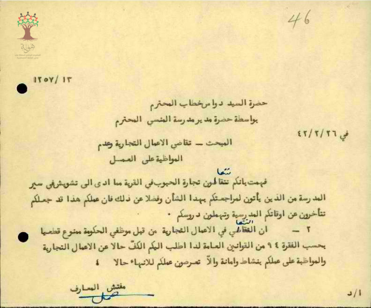 رسالة من مفتش المعارف إلى المعلم دواس خطاب يبحث معه أمر بيعه للحبوب في القرية ومنع تعاطي موظفي الحكومة للأعمال التجارية منعاً باتاً