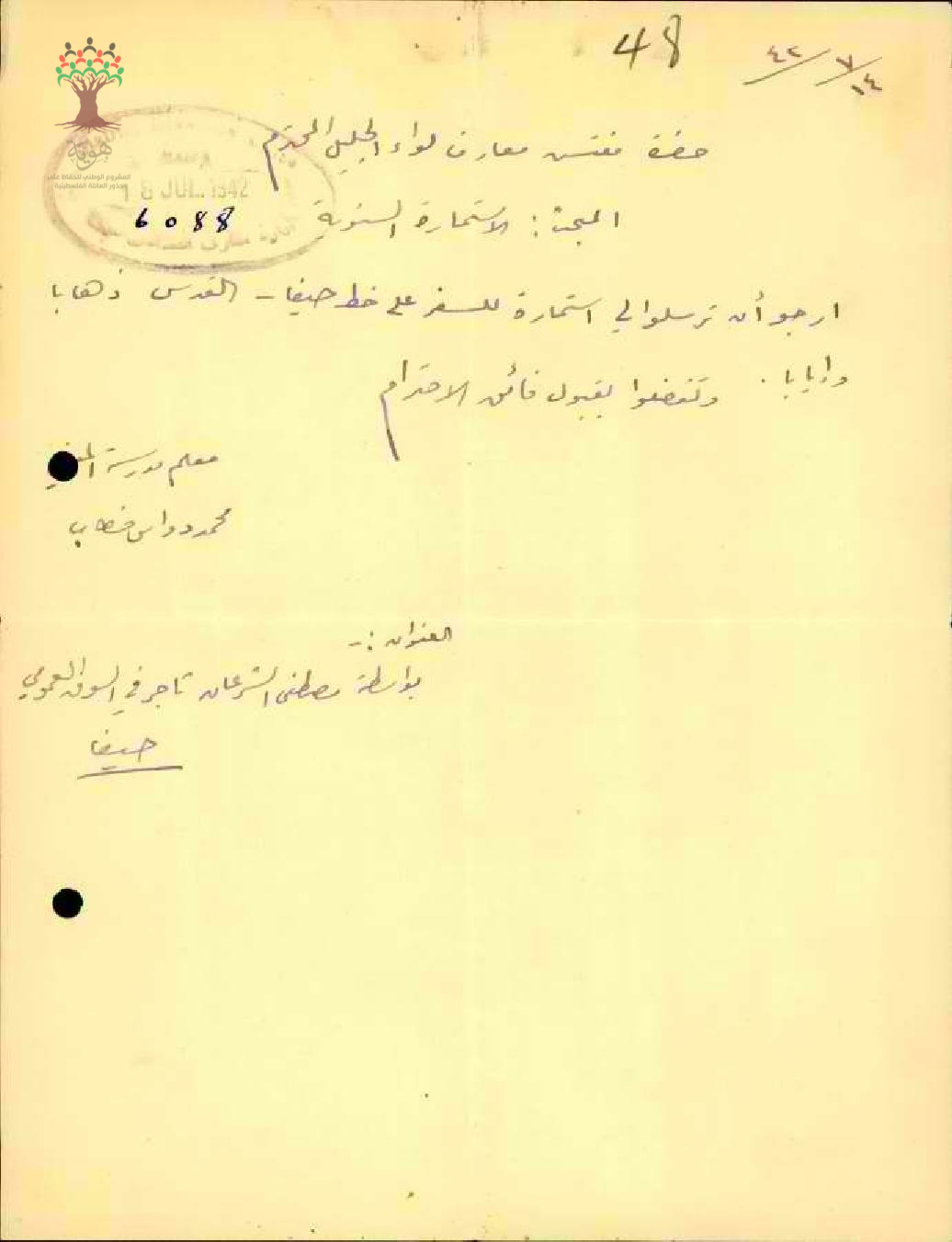 رسالة من المعلم دواس خطاب إلى مفتش المعارف يطلب منه ارسال استمارة للسفر على خط حيفا- القدس