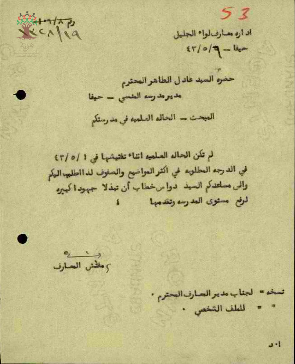 رسالة من مفتش المعارف إلى مدير مدرسة المنسي يطلب منه ومن المعلم دواس خطاب بذل مجهوداً أكبر لرفع مستوى المدرسة