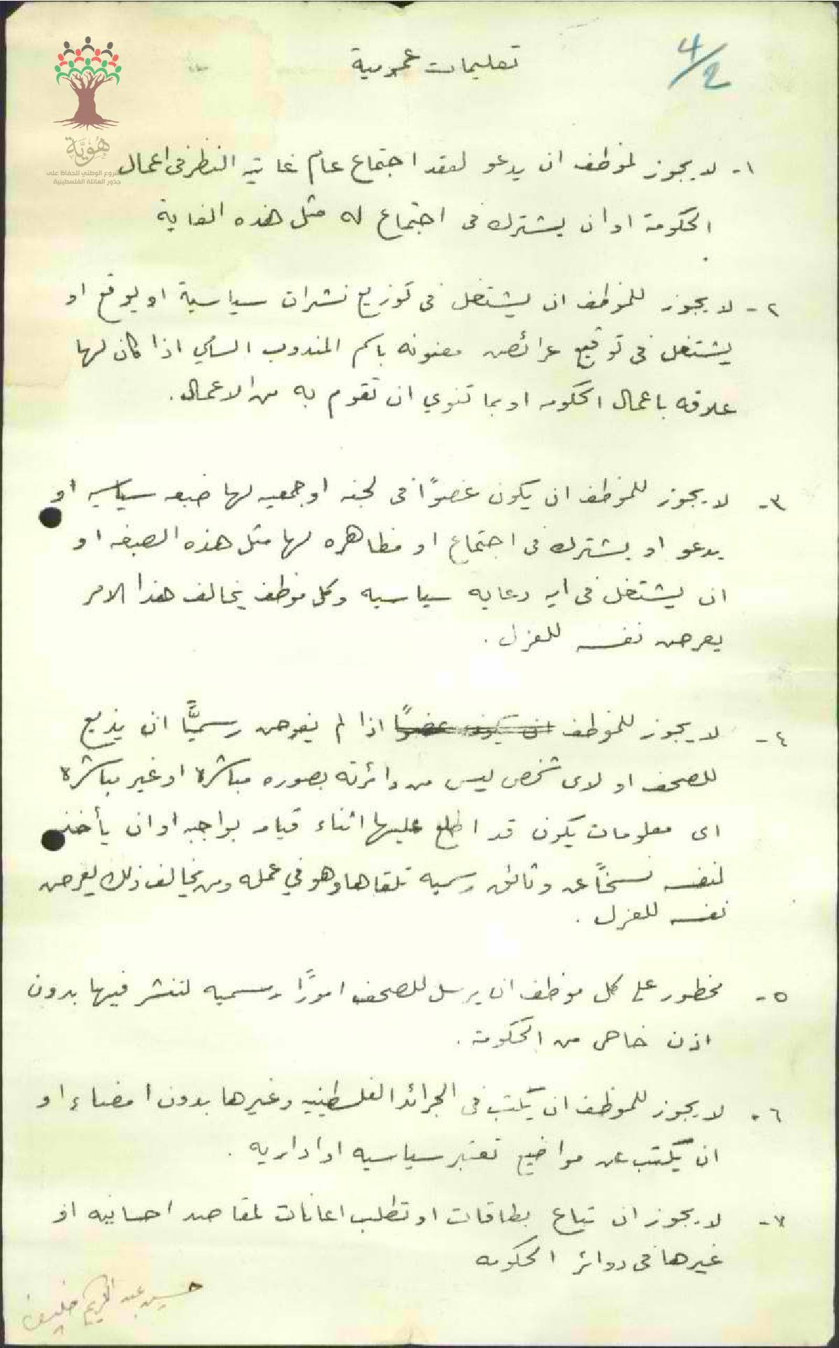 توقيع المعلم حسين عبد الكريم خليفة على التعليمات العمومية لإدارة المعارف