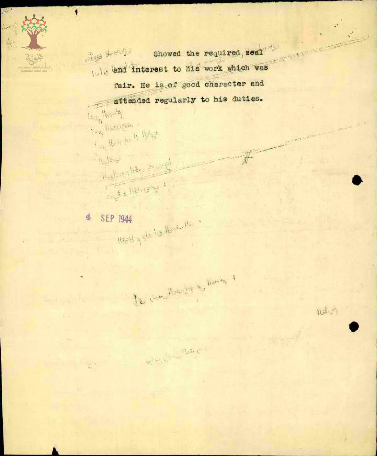 تقرير تفصيلي عن أداء المعلم دواس خطاب في مدرسة المنسي سنة 1944