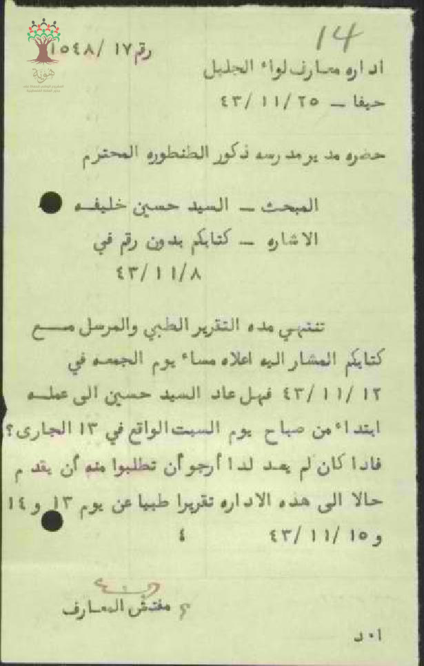 رسالة من مفتش المعارف الى مدير مدرسة الطنطورة للذكور يبحث عودة المعلم حسين عبد الكريم خليفة الى العمل