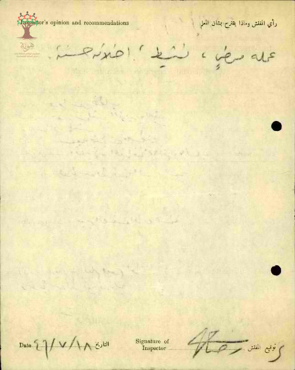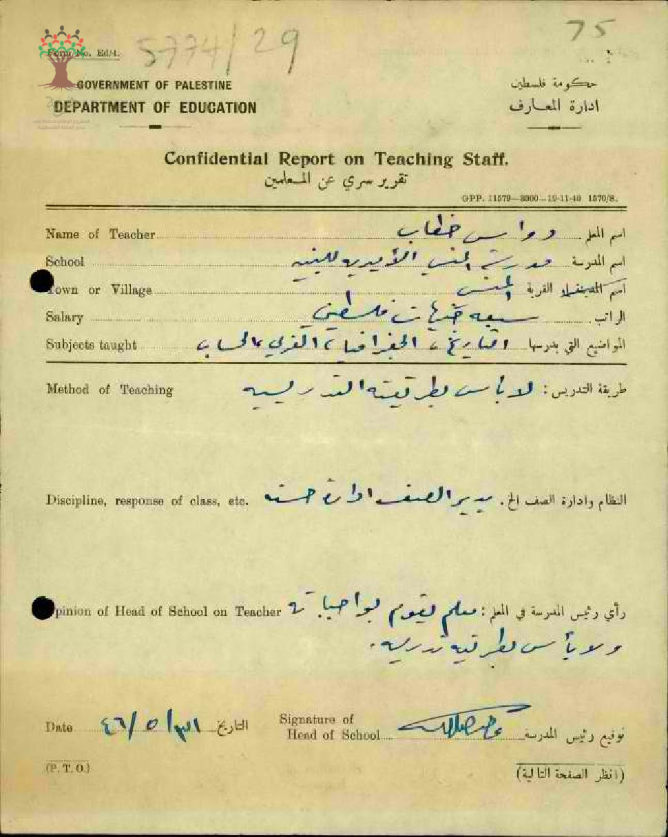 تقرير تفصيلي عن أداء المعلم دواس خطاب في مدرسة المنسي سنة 1946