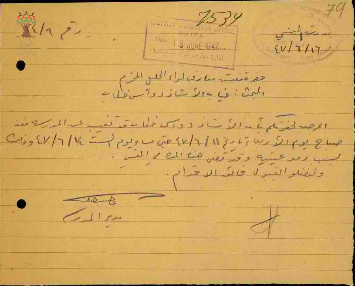 رسالة من مدير مدرسة المنسي إلى مفتش المعارف يعلمه بغاب المعلم دواس خطاب بسبب مرض رمد عينيه بتاريخ 11/6/1947 حتى مساء السبت 14/6/1947
