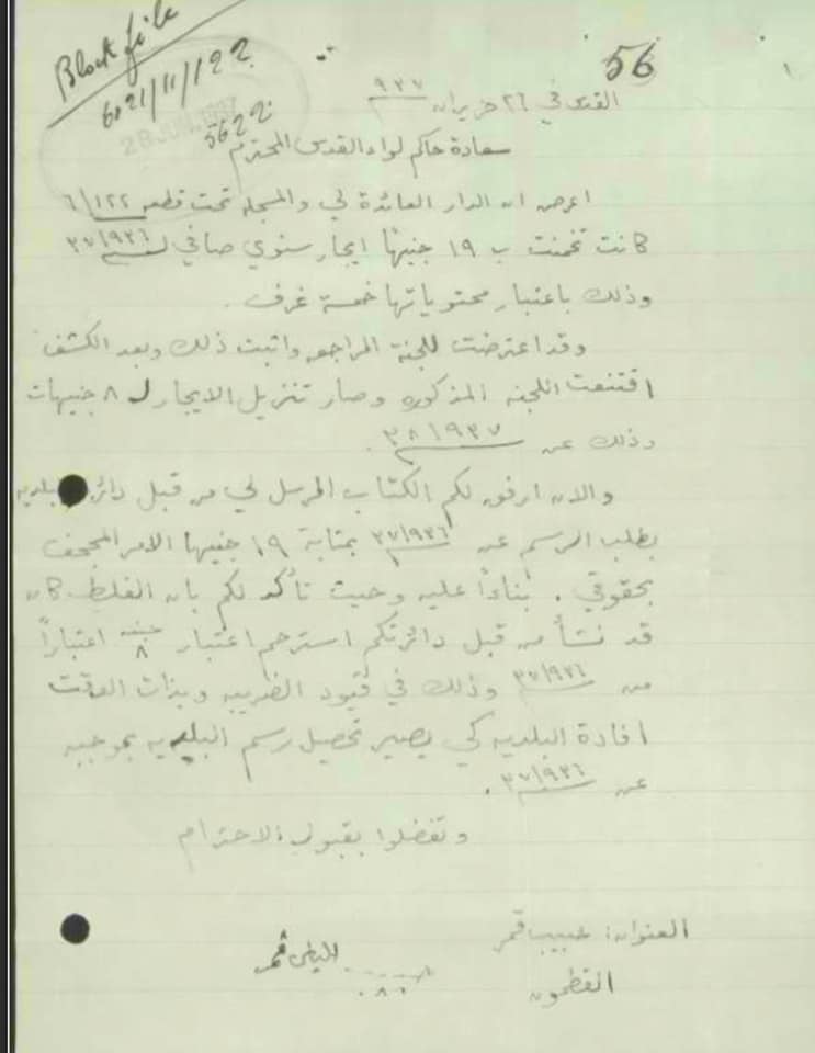 حبيب قمر يحتج على قيمة تخمين داره في القطمون حيث أن اللجنة قد قيمتها بـ 8 جنيهات ولكن مراجعته تتم على أساس 19 جنيهاً رغم تصحيح القيمة سابقاً.