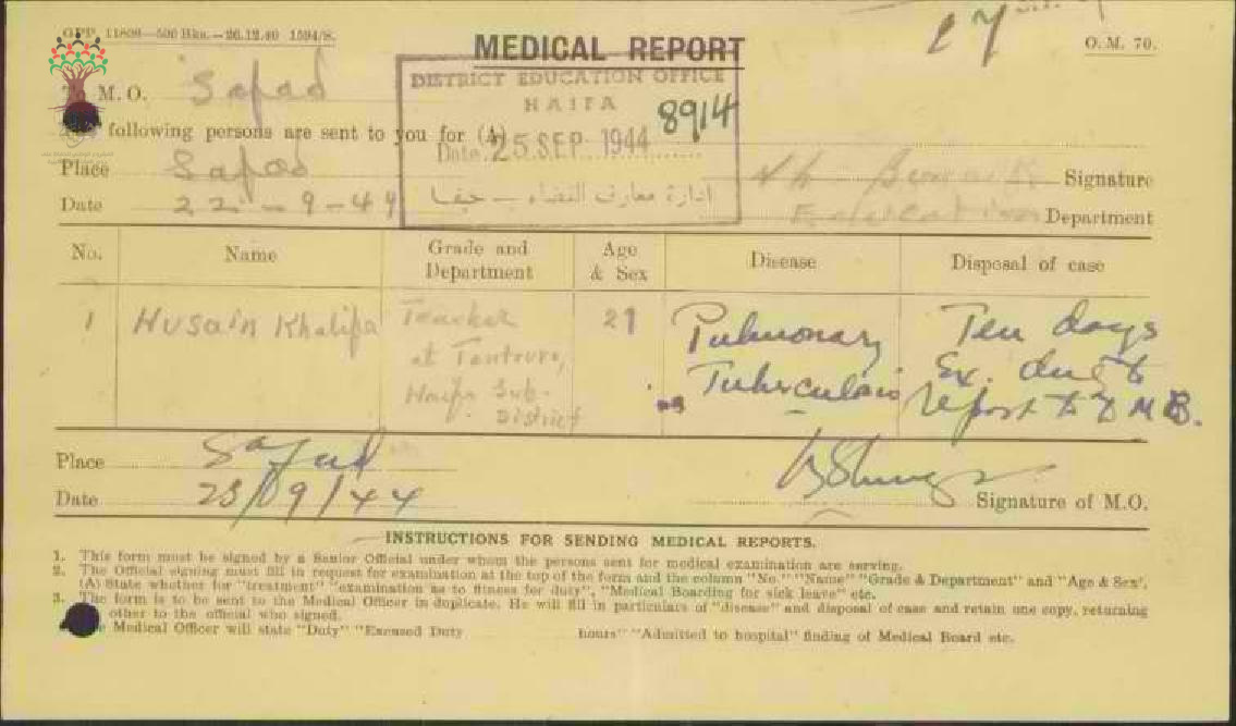 تقرير طبي عن غياب المعلم حسين عبد الكريم خليفة-مدرسة الطنطورة للذكور