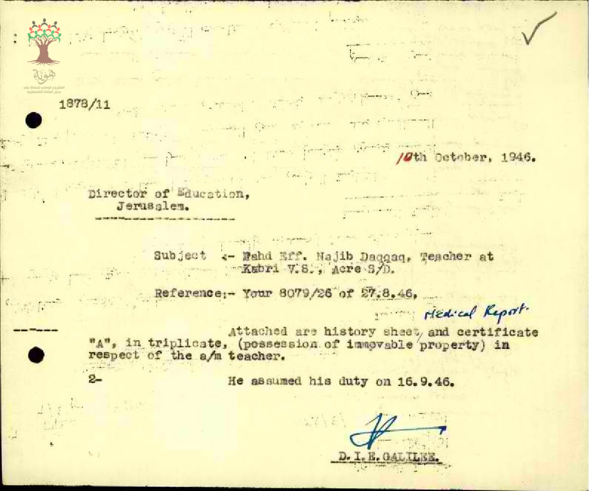 رسالة من مفتش المعارف الى مدير المعارف يعلمه بمباشرة المعلم فهد نجيب الدقاق عمله في مدرسة الكابري