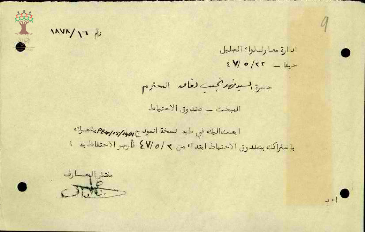 رسالة من مفتش المعارف الى المعلم فهد نجيب الدقاق يعلمه باشتراكه في صندوق الاحتياط