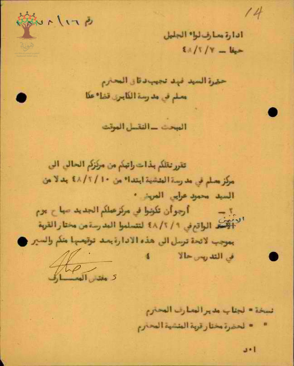 نقل المعلم فهد نديب الدقاق من مدرسة الكابري الى مدرسة المنشية