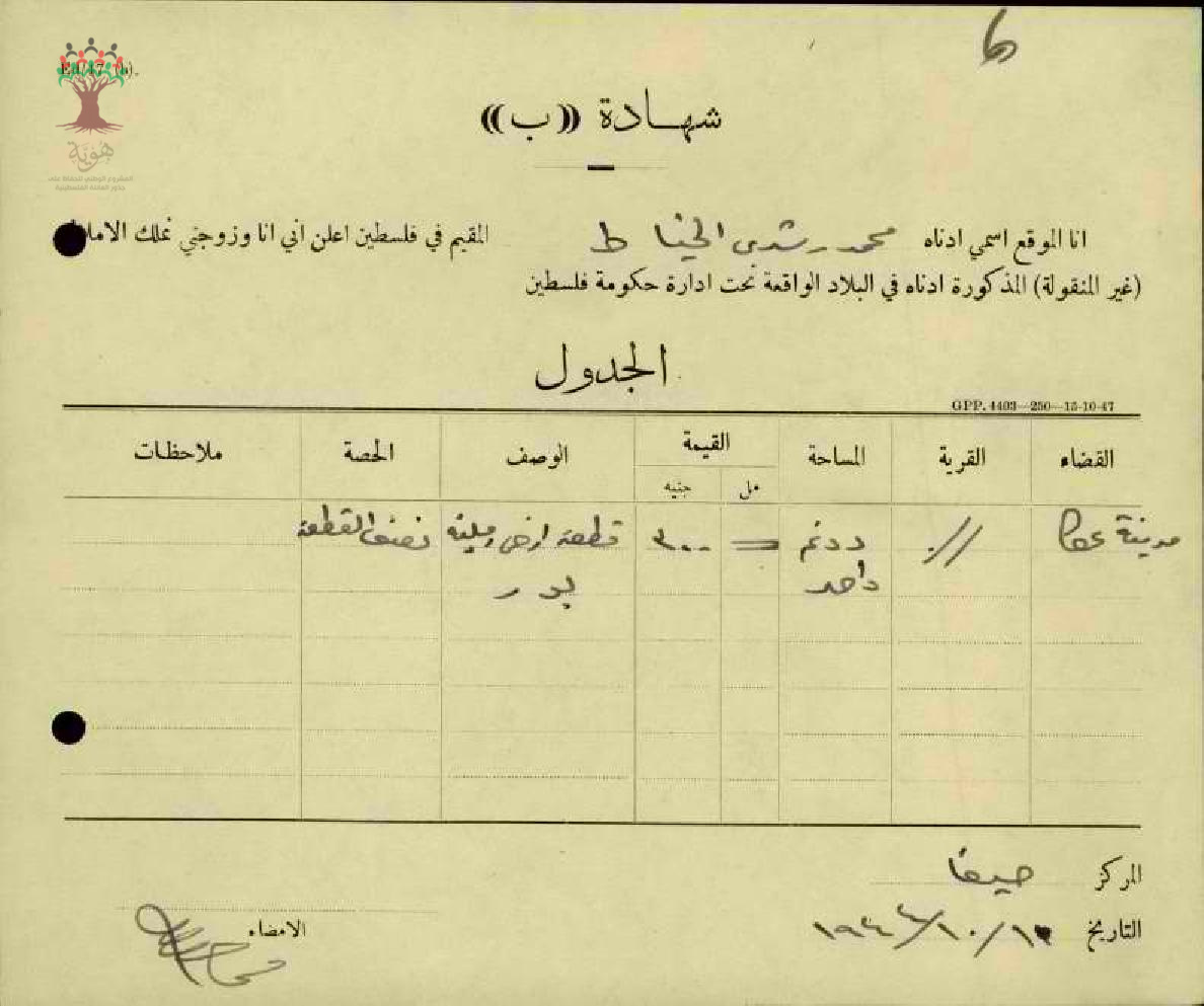 شهادة اثبات ملكية-المعلم محمد رشدي الخياط/عكا
