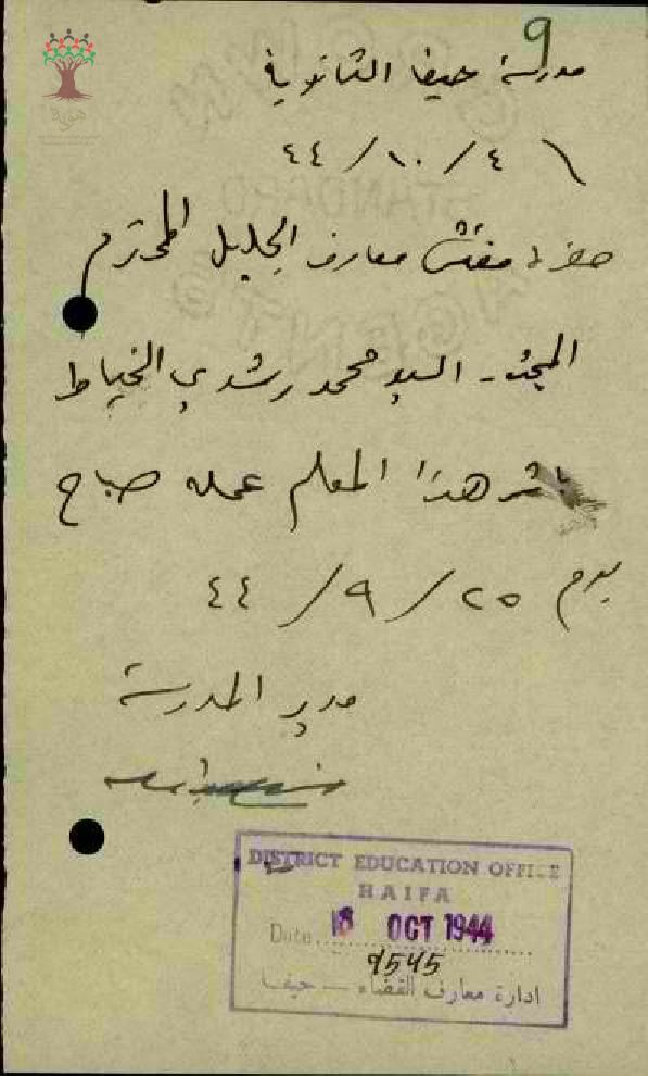 رسالة من مدير مدرسة حيفا الثانوية الى مفتش المعارف يعلمه بأن المعلم محمد رشدي الخياط قد باشر عمله