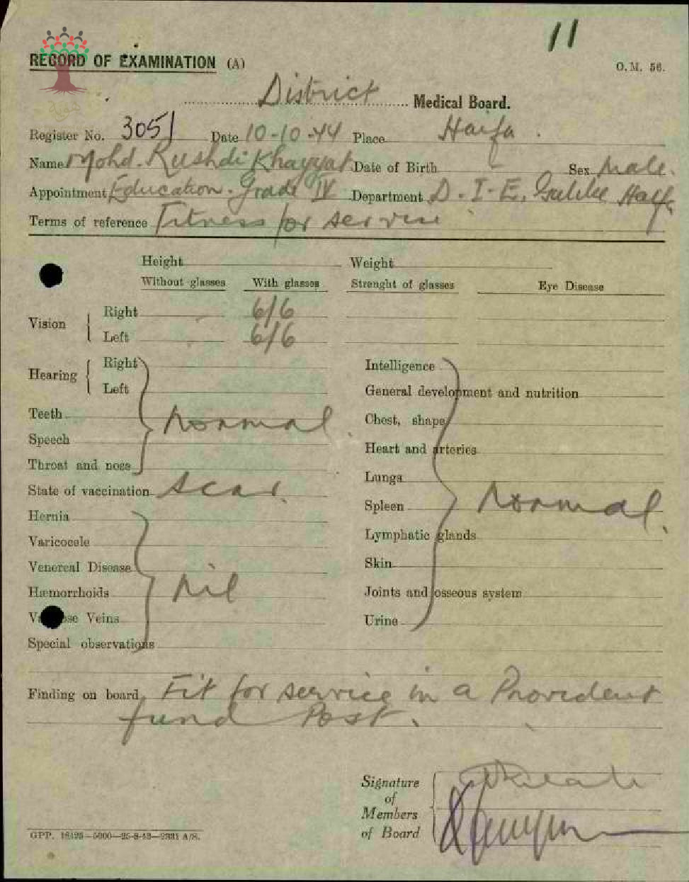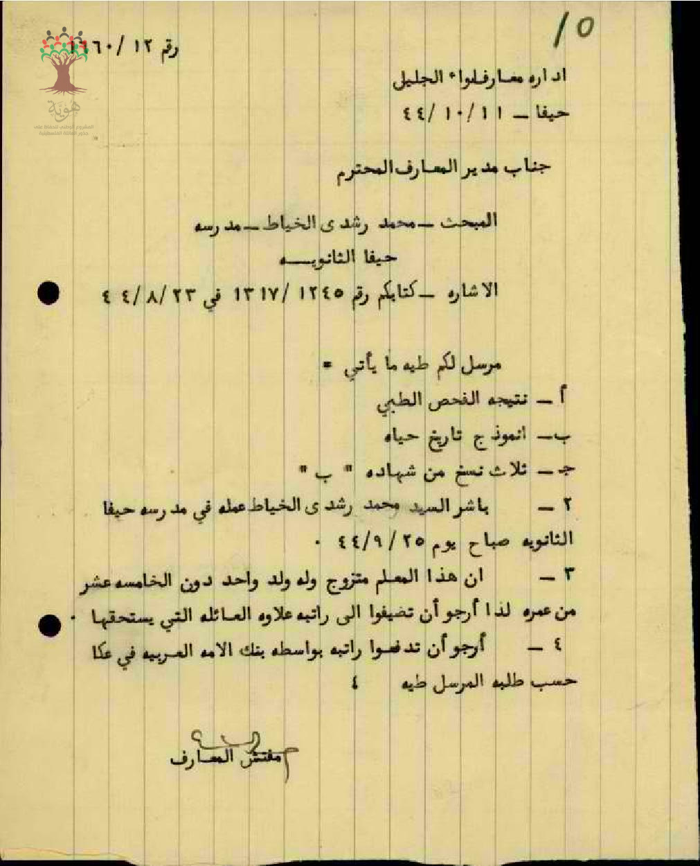 رسالة من مفتش المعارف الى مدير المعارف يعلمه ان المعلم محمد رشدي الخياط قد باشر عمله في مدرسة حيفا مرفقا بتقرير طبي