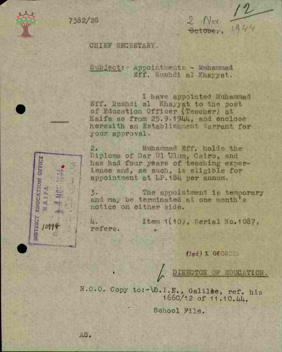 رسالة من مدير المعارف الى رئيس السكرتارية بخصوص تعيين المعلم محمد رشدي الخياط